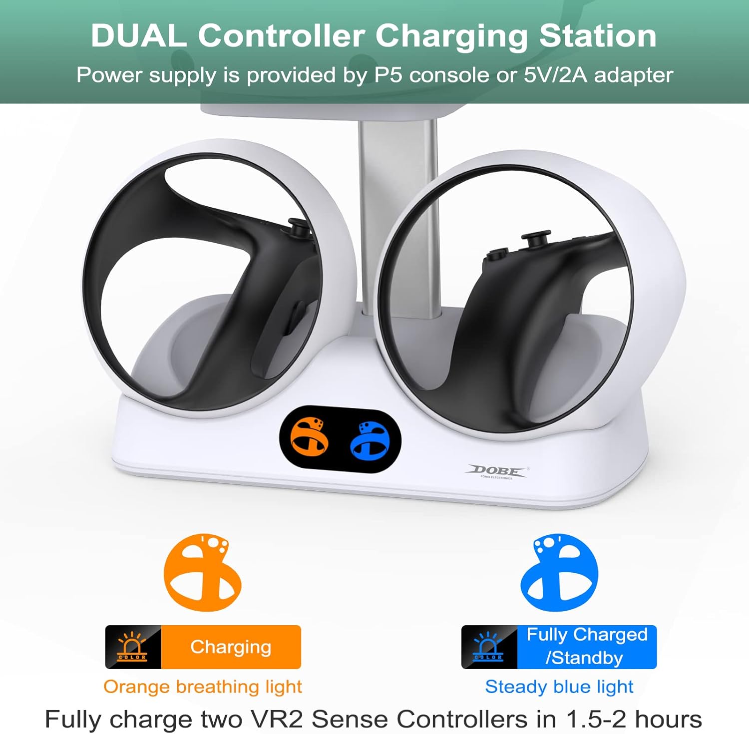 【Magnetische Dual Weitestgehend Charging Ladegerät Clear Indicators】Die Ladestation mit zwei Ladesteckplätzen und 2-magnetischem USB-Kohlenstoff-Konverter ist perfekt mit PS VR2 Sense Controllern kompatibel. Ladestation kann zwei VR 2 Controller in 1.5-2 Zahlungsfrist aufschieben vollwertig laden. Beim Aufladen zeigt die Ladeanzeige orange an, im Rahmen voller Ladung oder im Standby-Modus blau.