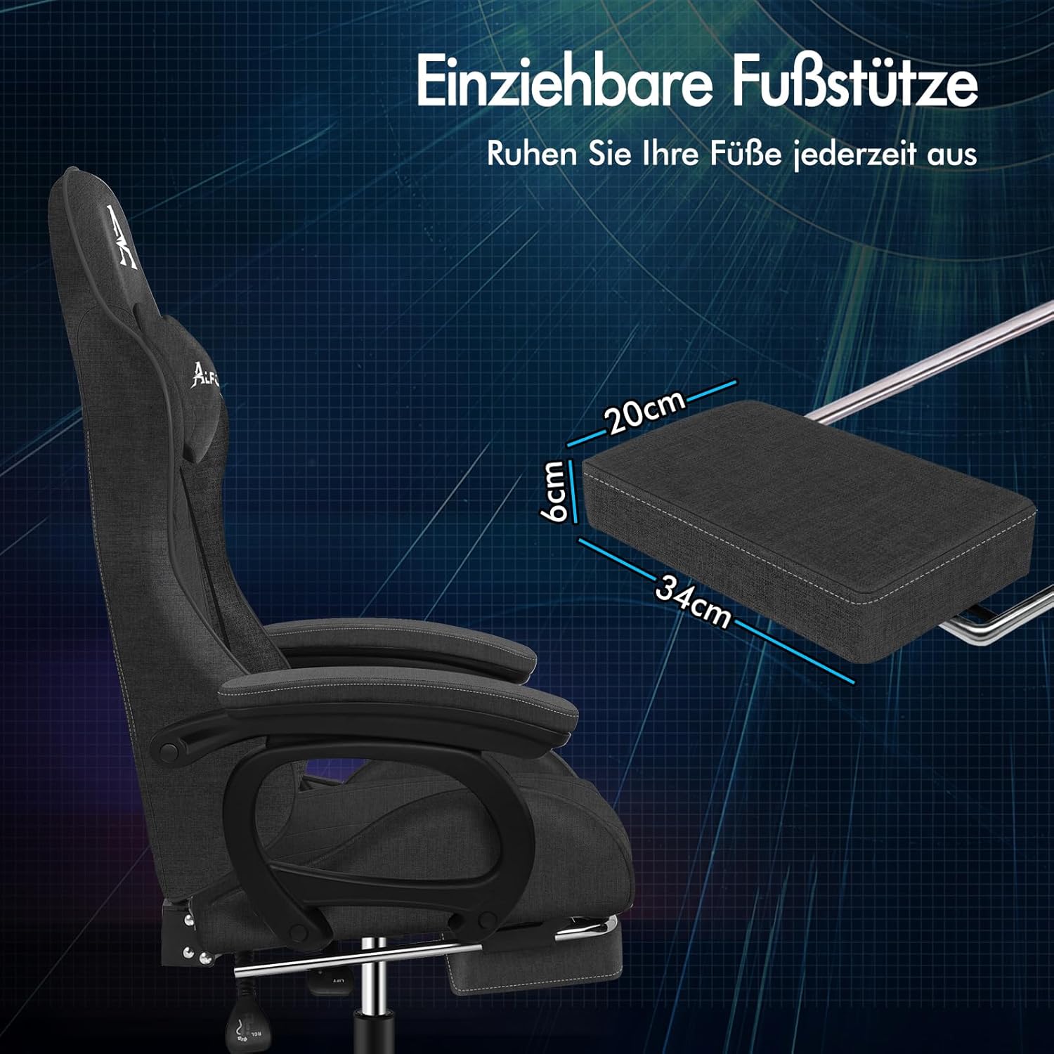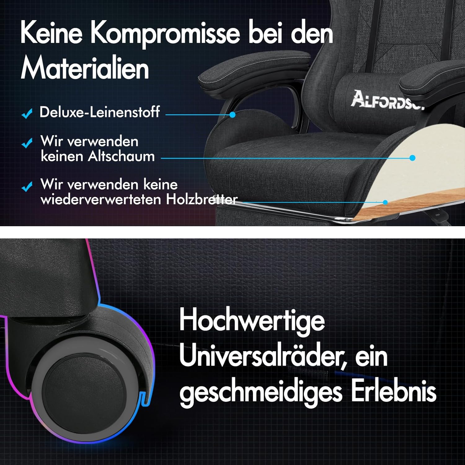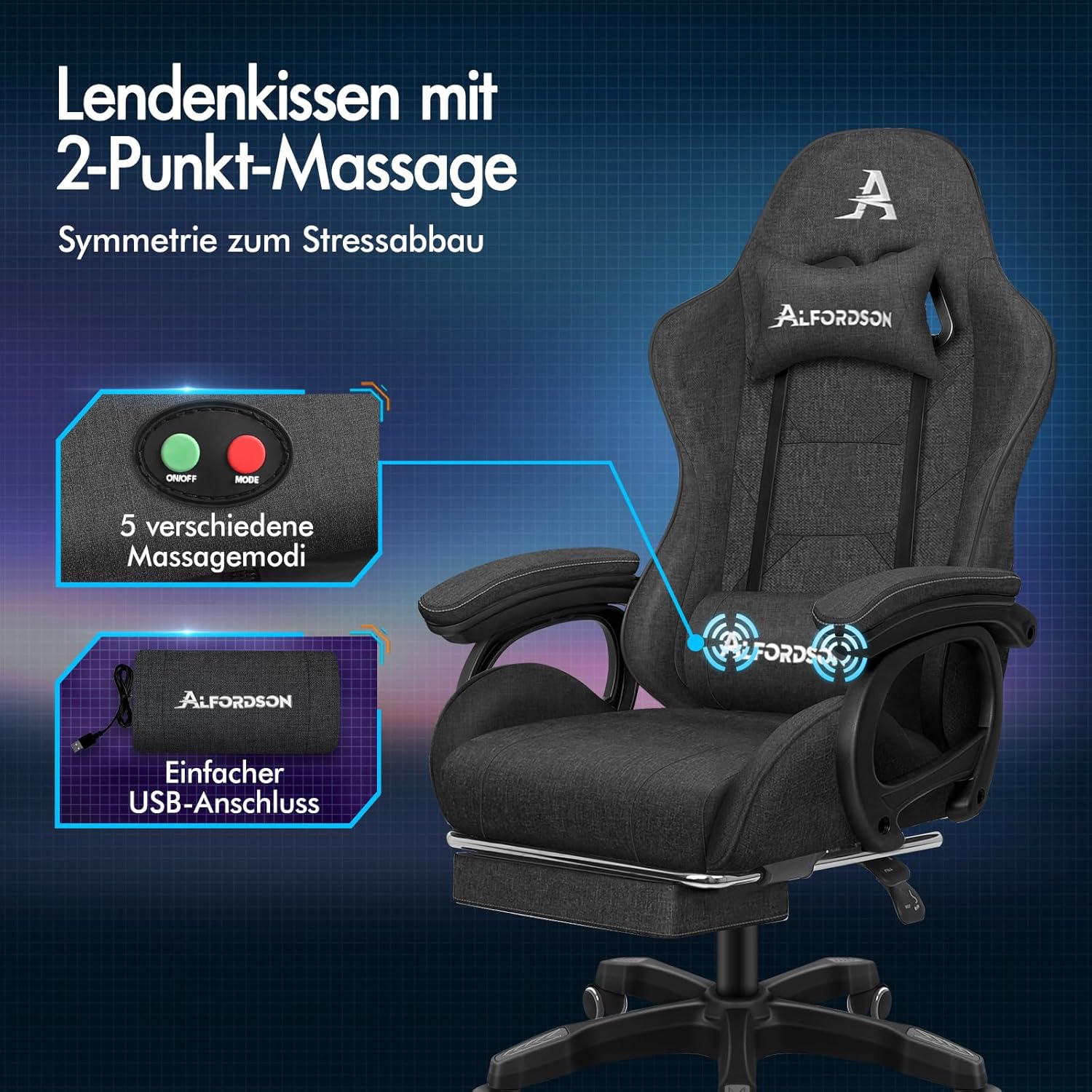 ALFORDSON Gaming Chair Office Chair with 2-Point Massage, Footrest, Headrest and Lumbar Cushion, 150° Adjustable Backrest, Linen Fabric, Dark Grey