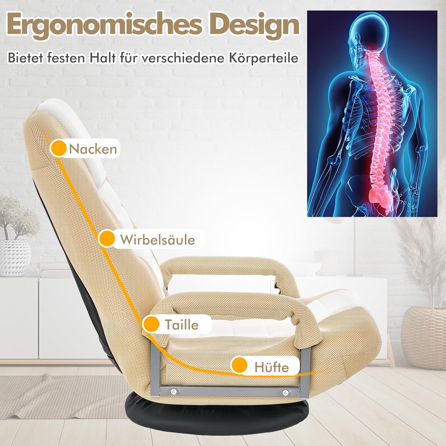 In 6 Positionen verstellbar und um 360° drehbar: Der Bodenstuhl ist mit einer sechsfach verstellbaren Rückenlehne ausgestattet, um individuellen Anforderungen gerecht zu werden. Stellen Sie die Rückenlehne ganz einfach in den gewünschten Winkel ein, Sie müssen lediglich Druck darauf ausüben. Die um 360° drehbare Basis bringt mehr Komfort.