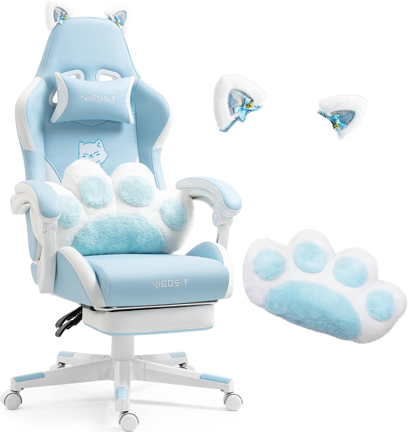 Cute Gaming Chair with Cat Paw Lumbar Cushion and Cat Ears, Ergonomic Gamer Chair with Footrest, Adjustable PC Game Chair for Girls, Teenagers, Children, Blue