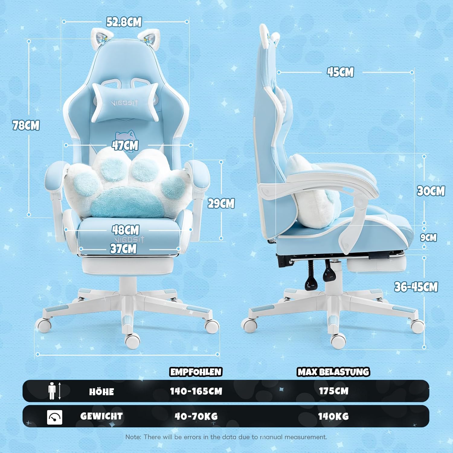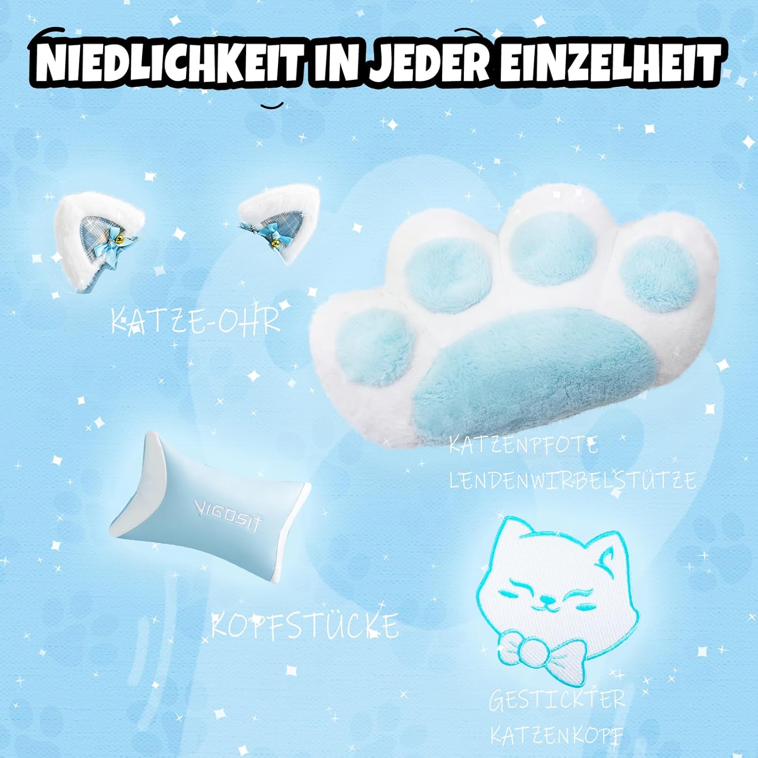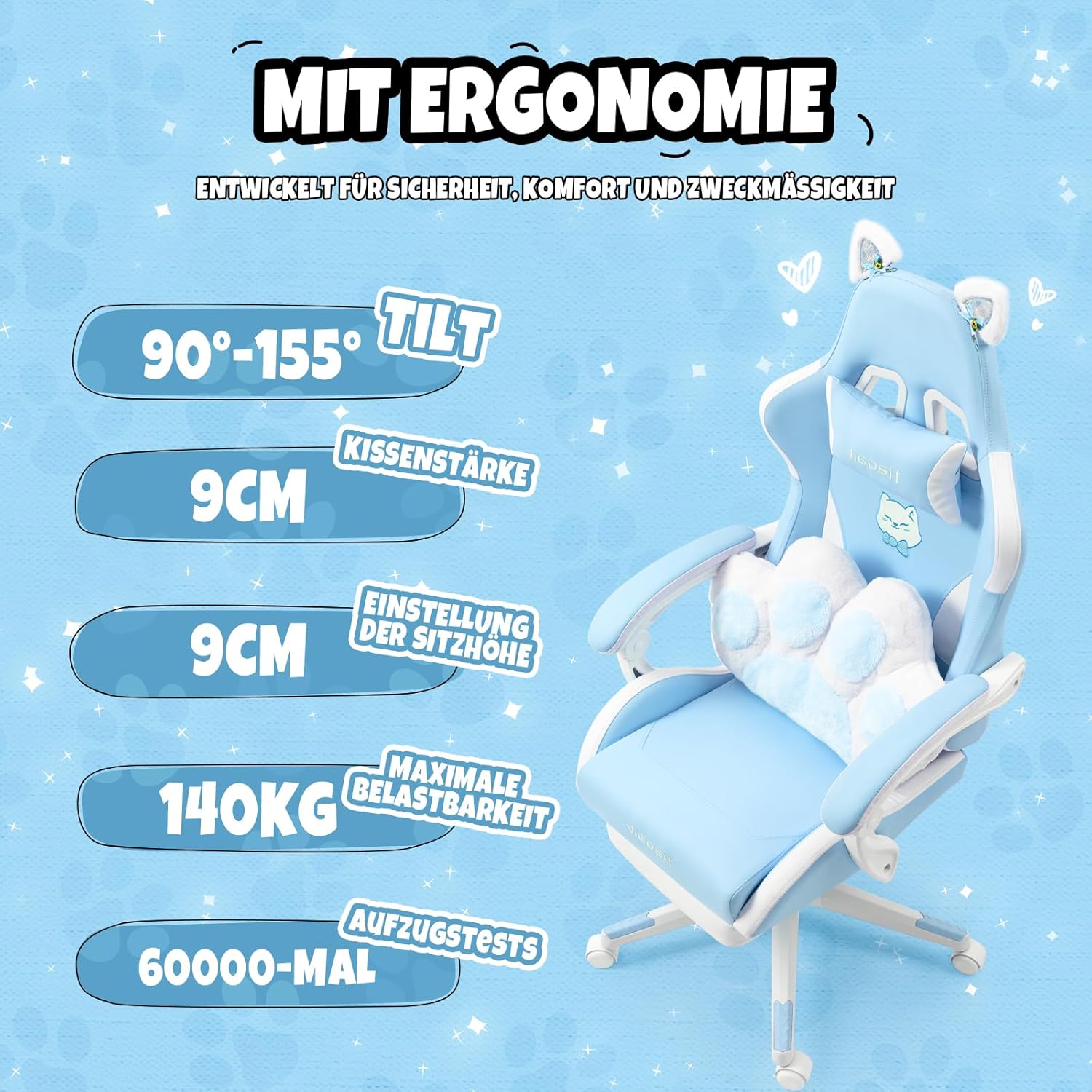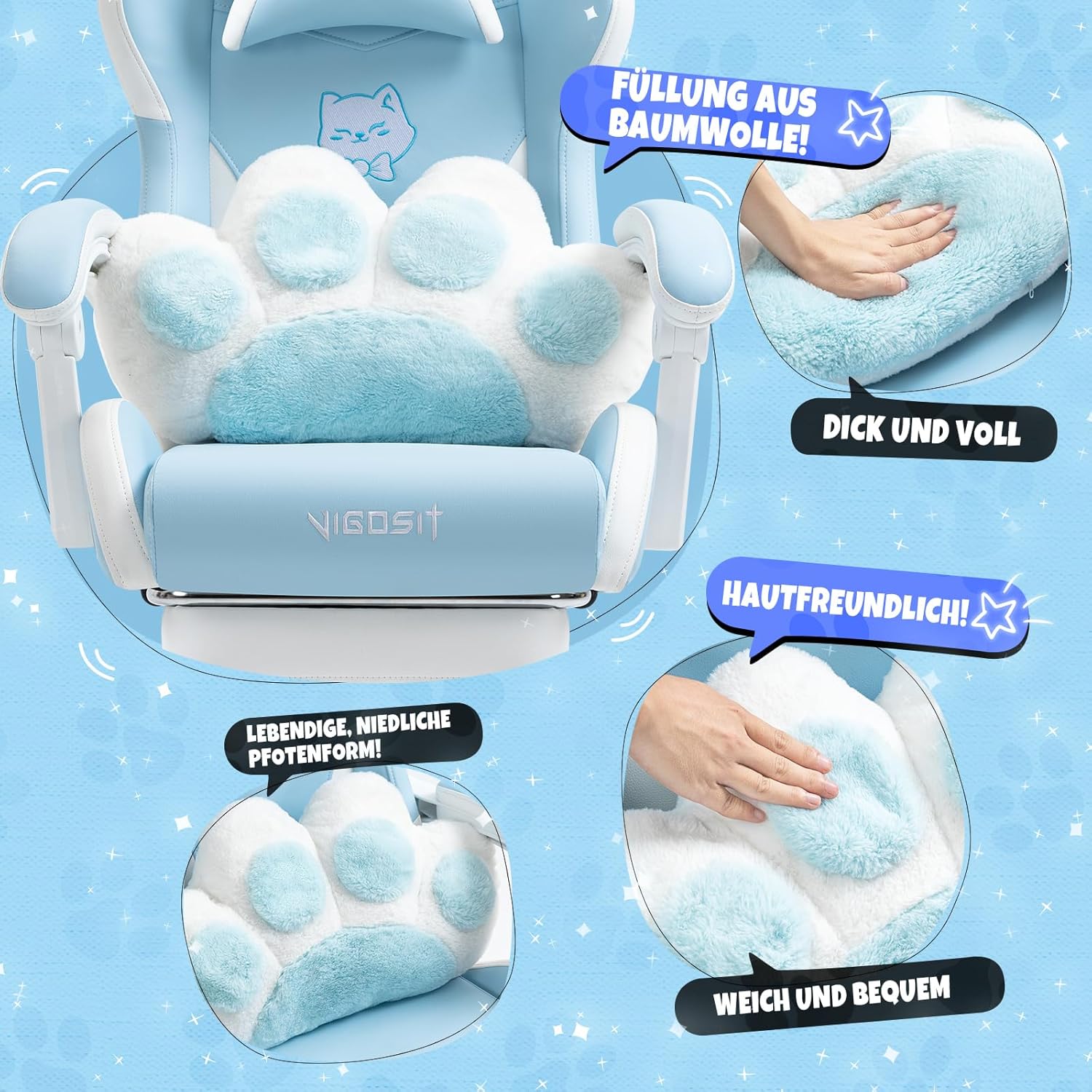NIEDLICHE DEKORATIONEN Wir haben diesen Gaming-Stuhl mit niedlichen Katzenohren und einem Lendenkissen in Katzenpfotenform entworfen und ein Katzenkopf-Logo auf die Rückseite des Stuhls gestickt, damit der Stuhl dynamischer und niedlicher aussieht. Die Katzenohren können entfernt und ersetzt werden.