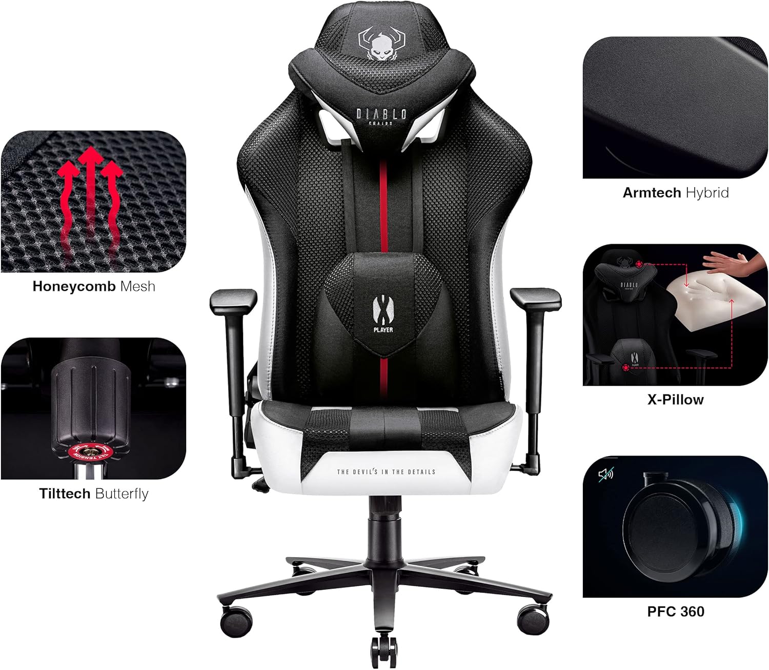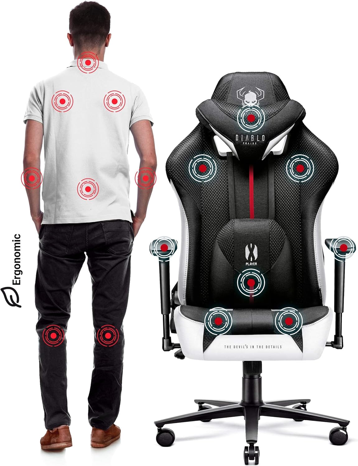 Gaming-Stuhl Diablo X-Player – Der Stuhl bietet außergewöhnlichen Sitzkomfort während einer Gaming-Session oder bei längerer Arbeit am PC. Sorgfältige Ästhetik verbindet sich mit einem diabolischen Charakter. Ergonomisch gestaltet, um Ihre Wirbelsäule entsprechend zu stützen. Perfekt für den Heim- und Bürogebrauch.