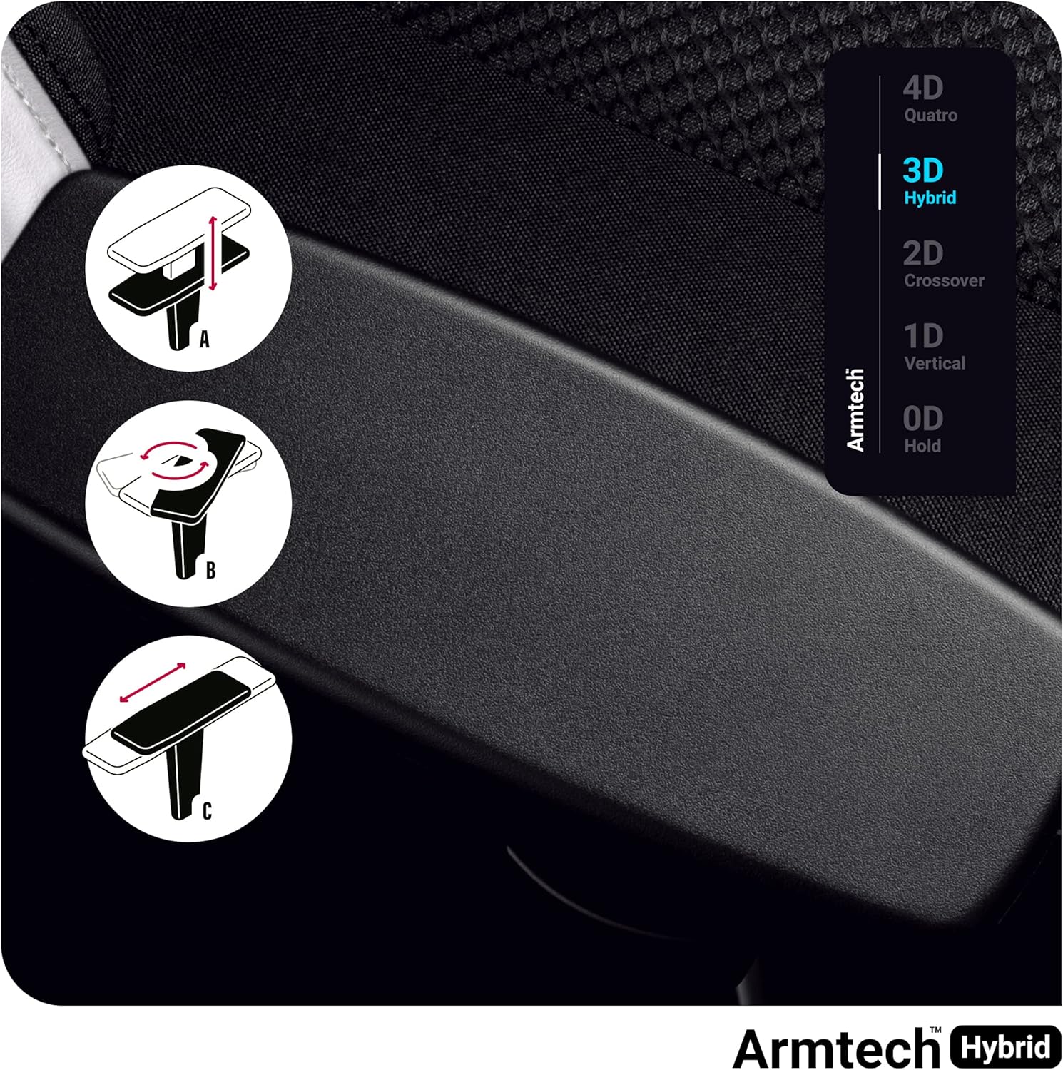 Die Armlehnen sind in 3 Größen verstellbar: vertikal – nach oben/unten, horizontal – vorne/hinten und seitlich drehbar.