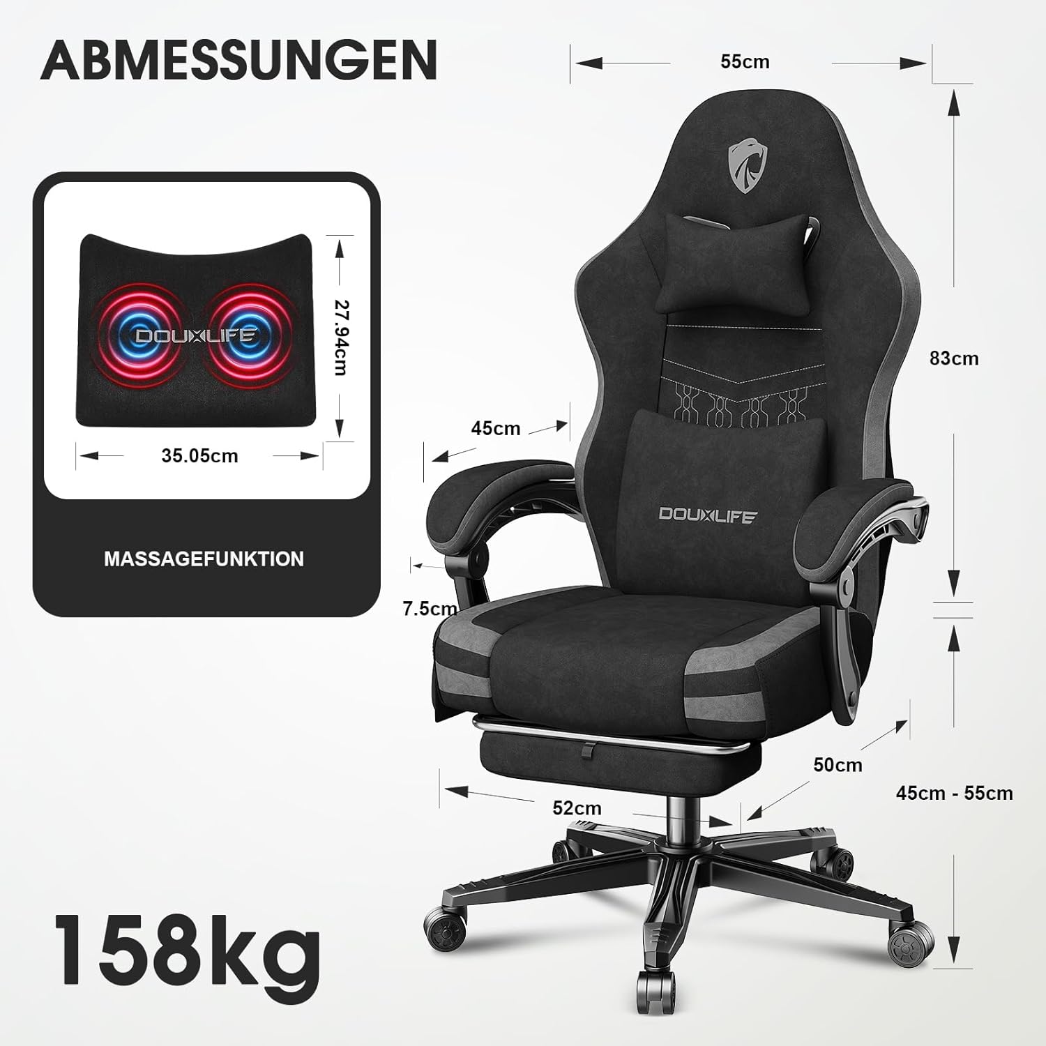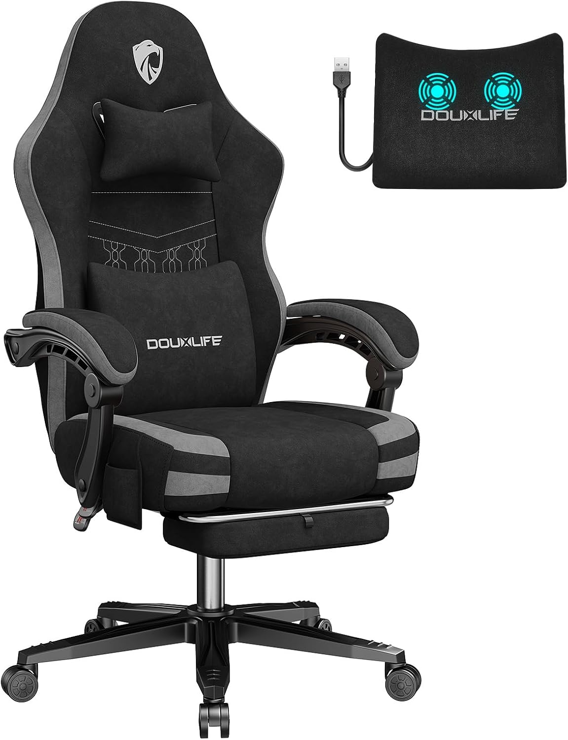 Douxlife Gaming Chair Fabric with Massage, Widened Seat Cushion with Pocket Springs, Ergonomic Office Chair, PC Gamer Chair with Footrest and Metal Feet, 158 kg Load Capacity, Grey