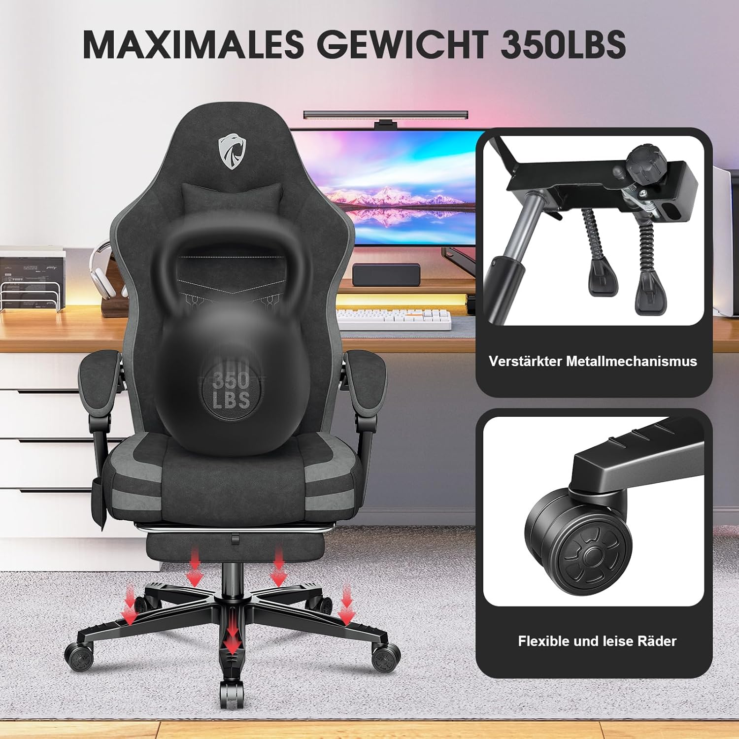 Verbesserte Materialien für höhere Tragfähigkeit: Dieser Computerstuhl verfügt über einen robusten Metallrahmen der Klasse A, eine verdickte, explosionsgeschützte Basis für 158 kg Tragfähigkeit. Leise 360°-Räder schonen den Boden