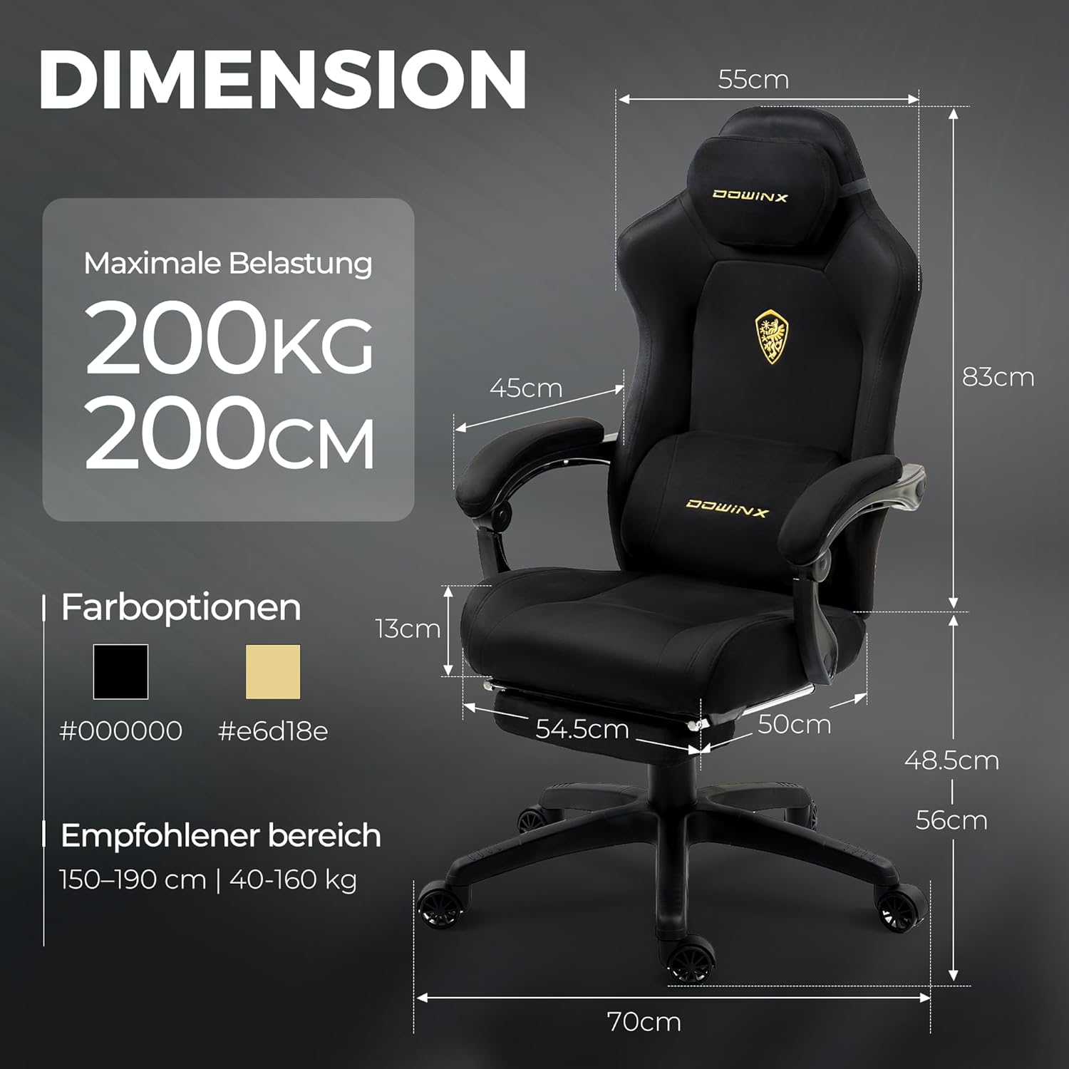 An unterschiedliche Körpergrößen anpassbar: Große Sitzfläche, 8 cm höhenverstellbares Lendenkissen, verstellbare Armlehnen und ausziehbare Fußstütze – perfekt für Gaming, Homeoffice oder Entspannung. Geeignet für verschiedene Körpergrößen und Gewichtsklassen bis 200 kg.