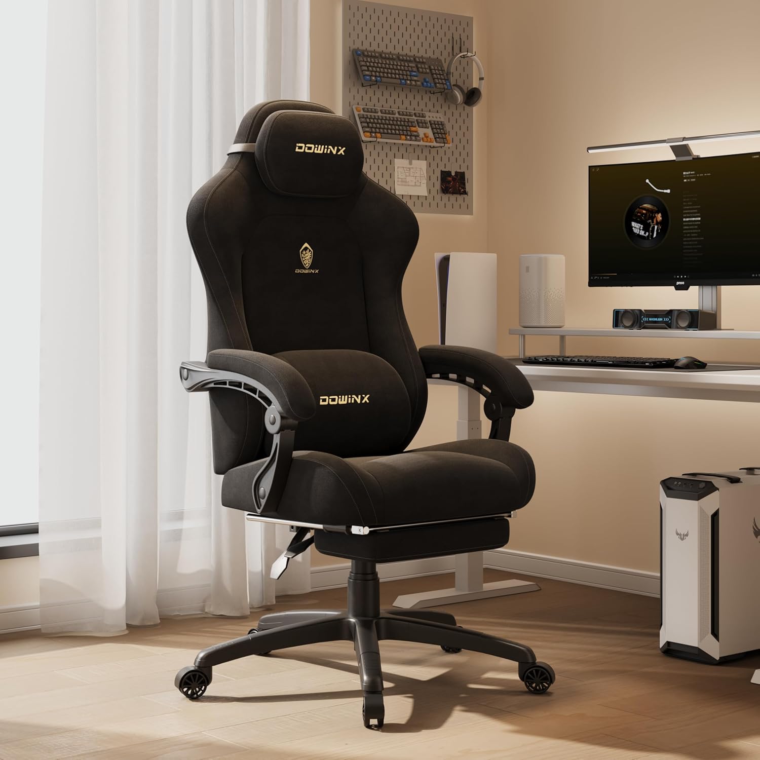 Dowinx Ergonomic Gaming Chair with Adjustable Massage Lumbar Cushion, Microfibre Velour, Thick Seat Padding, Extendable Footrest, Adjustable Armrests, 160° Tilt, Light Black