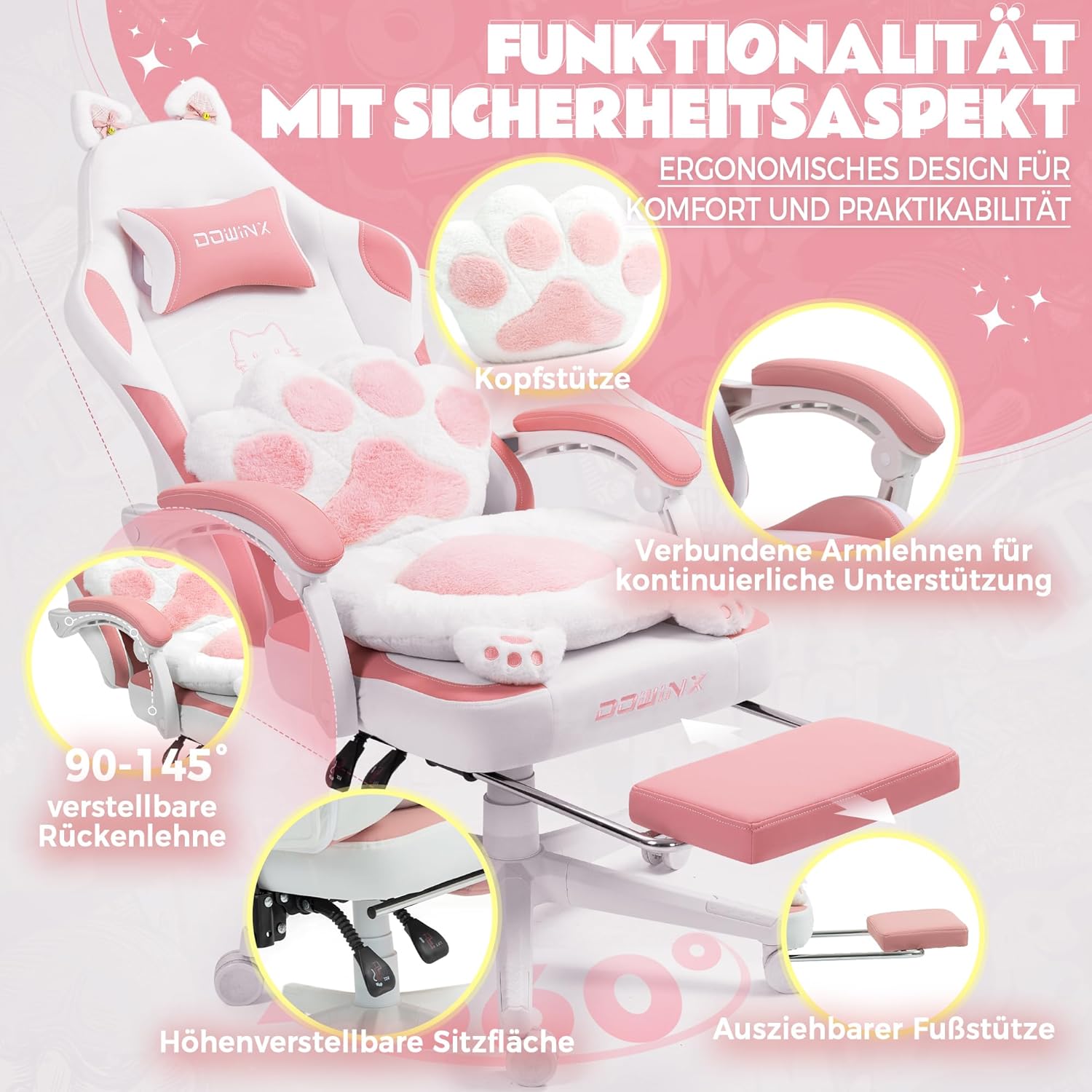 Vielseitig einsetzbar und charmanter Blickfang: Ob beim intensiven Gaming, Arbeiten oder Entspannen – dieser ergonomische Stuhl ist der ideale Begleiter. Das bezaubernde Katzendesign des Dowinx-Gaming-Stuhls macht ihn zu einem absoluten Hingucker in jedem Raum und ist perfekt für alle, die einen einzigartigen rosa Gaming-Stuhl lieben.