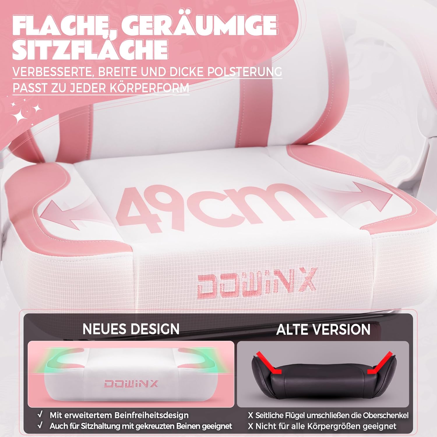 Optimiertes, komfortables Sitzgefühl: Das flügellose Design des Gaming-Stuhls bietet eine große, flache Sitzfläche. Dies gibt Ihnen mehr Bewegungsfreiheit für unterschiedliche Sitzpositionen und verhindert ein Drücken auf die Oberschenkel, was diesen rosafarbenen Gaming-Stuhl besonders benutzerfreundlich macht.
