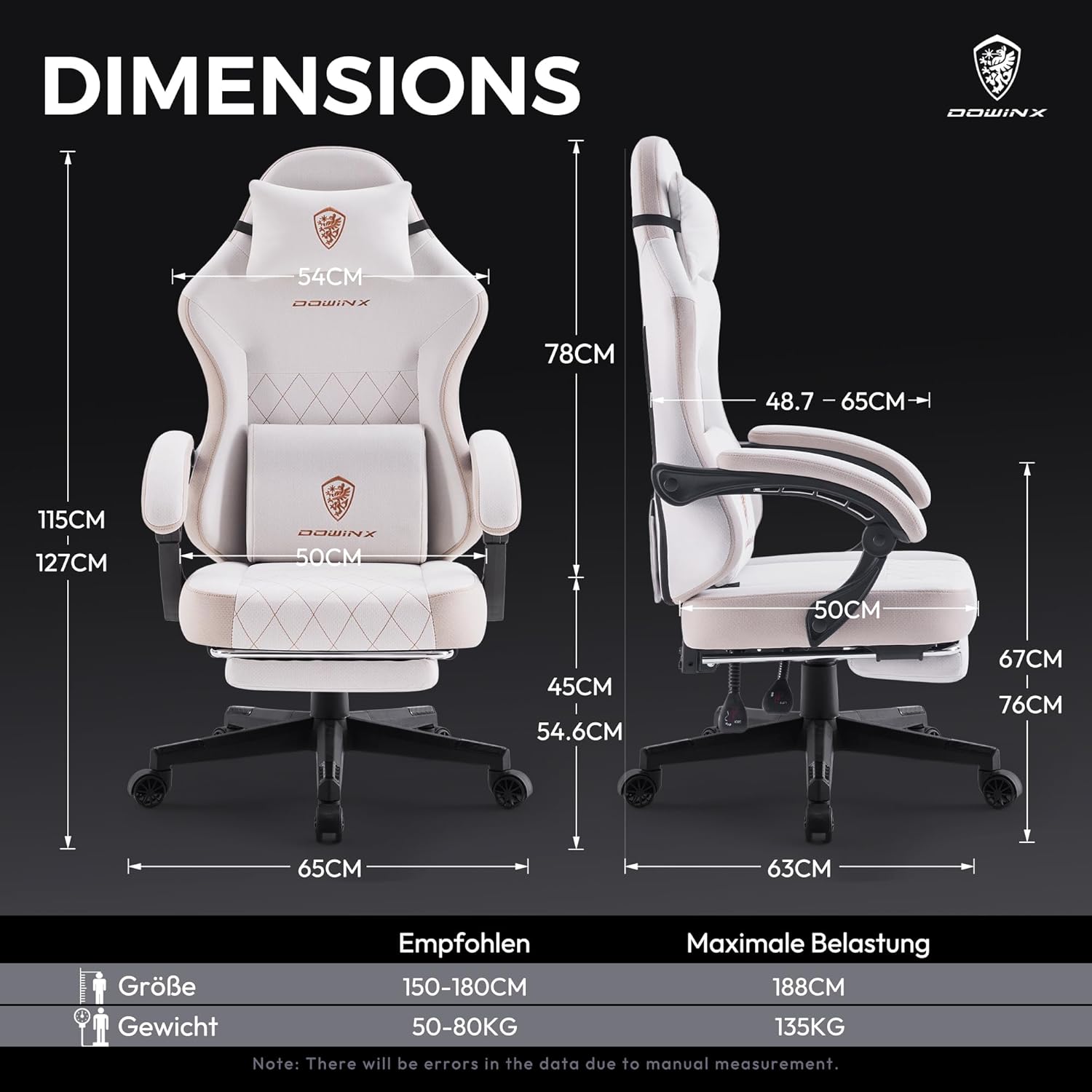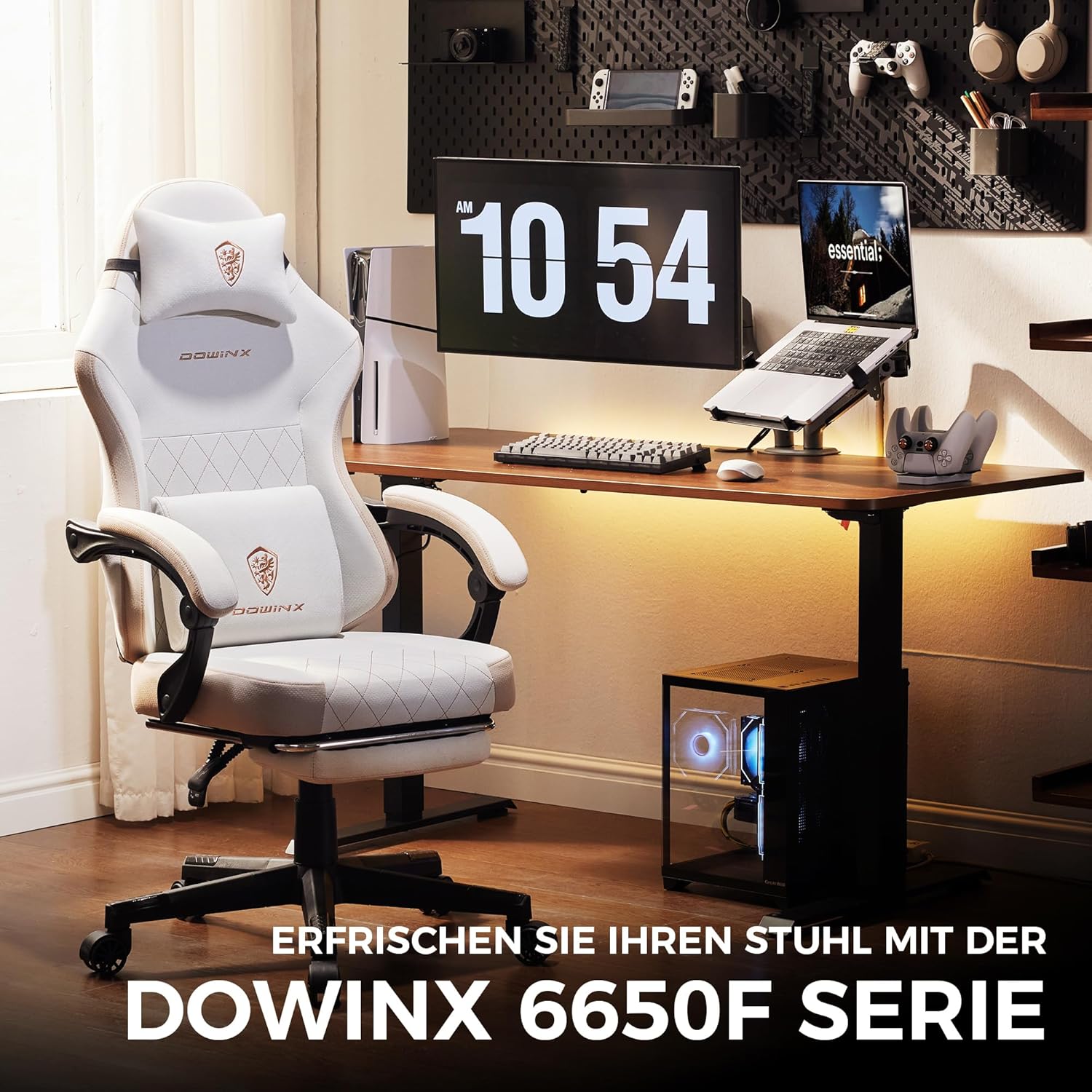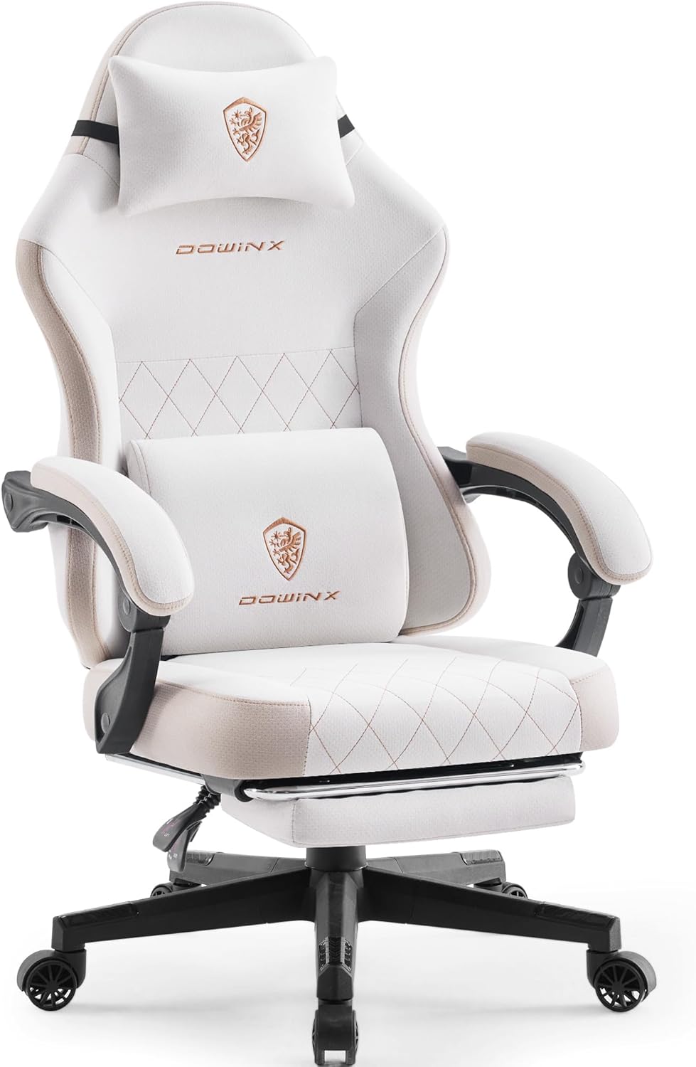 Dowinx Gaming Chair Fabric with Spring Cushion, Massage Lumbar Support, Office Chair with Footrest for Adults, Ergonomic Gaming Armchair, Large and High for Office Gaming, 135 kg, Beige