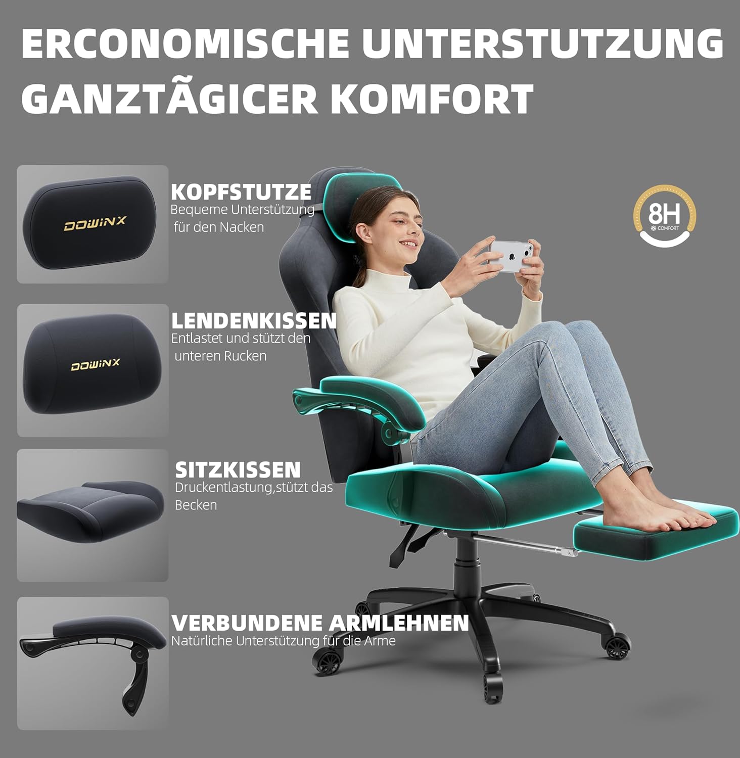 Dowinx Gaming Chair, Height-Adjustable Massage Lumbar Cushion, Ergonomic, Soft Microfibre Velour, Thickened Seat Padding, Headrest and Footrest Included, 155° Tilt, Grey