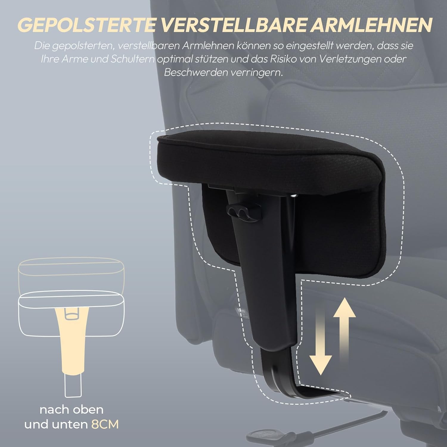 - 🕹️ Verstellbare Armlehnen: Ideal für präzises Gaming und entspanntes Sitzen