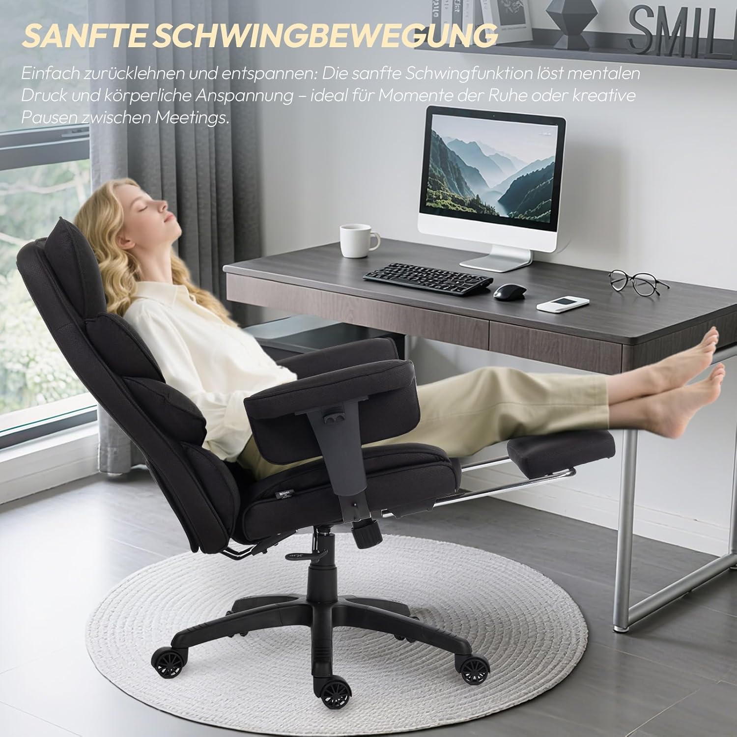 FLEXIBLE EINSTELLBARKEIT: Dieser Chefsessel bietet einen vielseitigen Verstellbereich von 90° bis 135°, der verschiedene Aktivitäten ermöglicht, egal ob Sie arbeiten oder entspannen. Die verstellbaren, gepolsterten Armlehnen können für individuellen Komfort und Halt auf Ihre bevorzugte Höhe eingestellt werden.