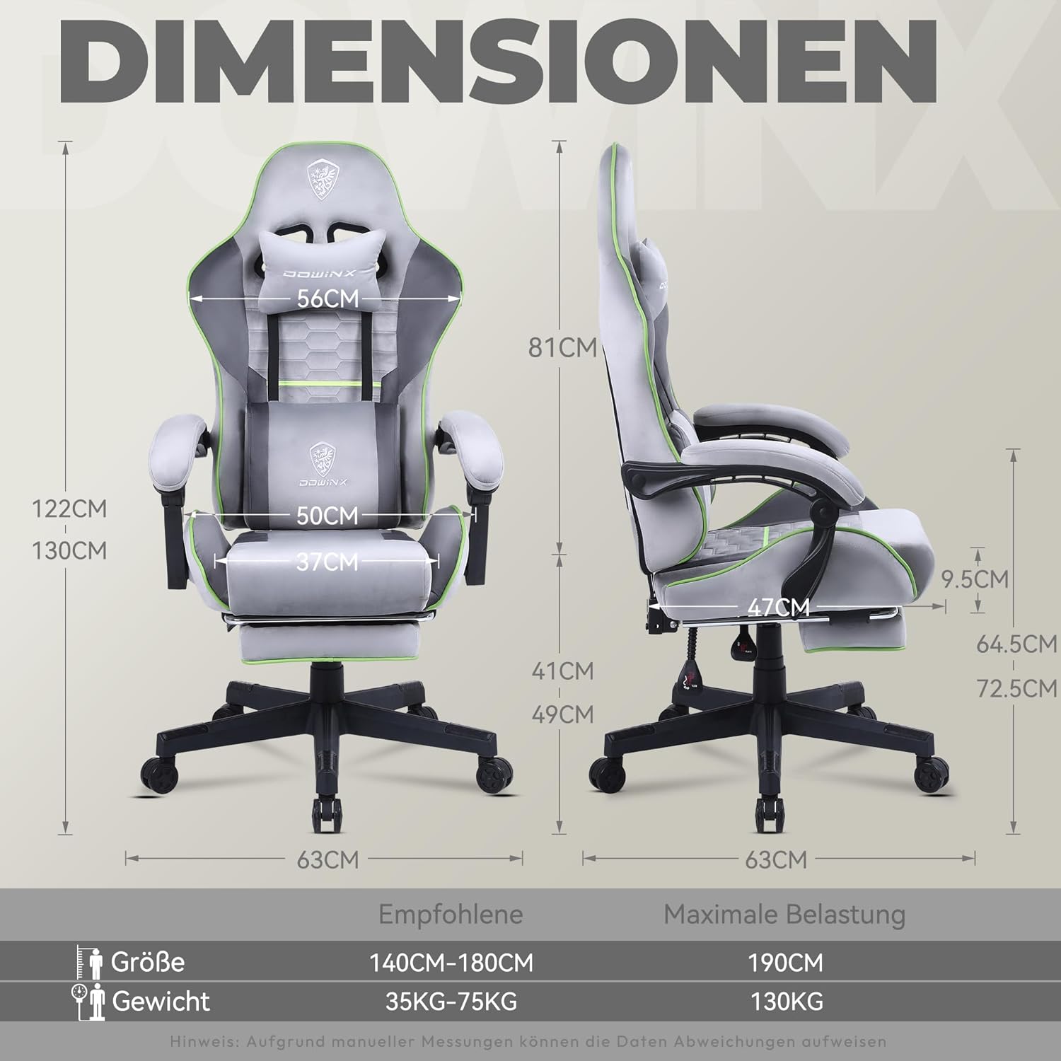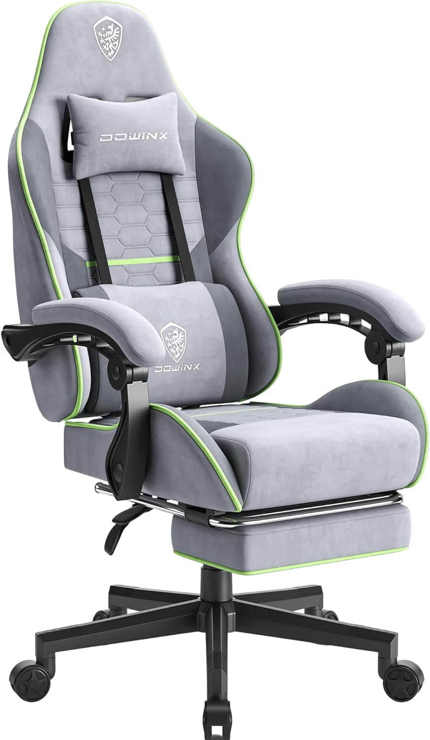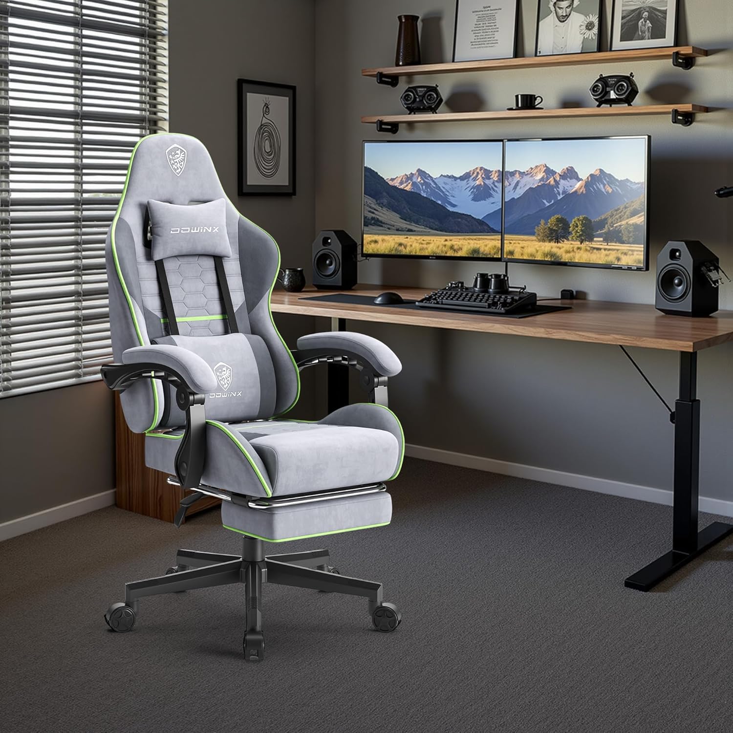 Dowinx Gaming Chair, Office Chair, Fabric Bag, Spring Cushion, Massage Gamer Chair Fabric with Headrest, Ergonomic Office Chair with Footrest (Grey and Green)