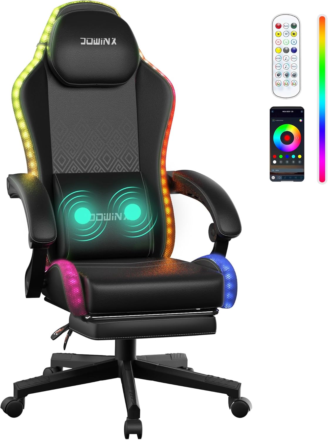 Dowinx Gaming Chair with RGB Lights, LED Gaming Chair with Footrest for Adults, Ergonomic Gaming Chair with Massage Lumbar Support, Video Game Chair, PU Leather, Black