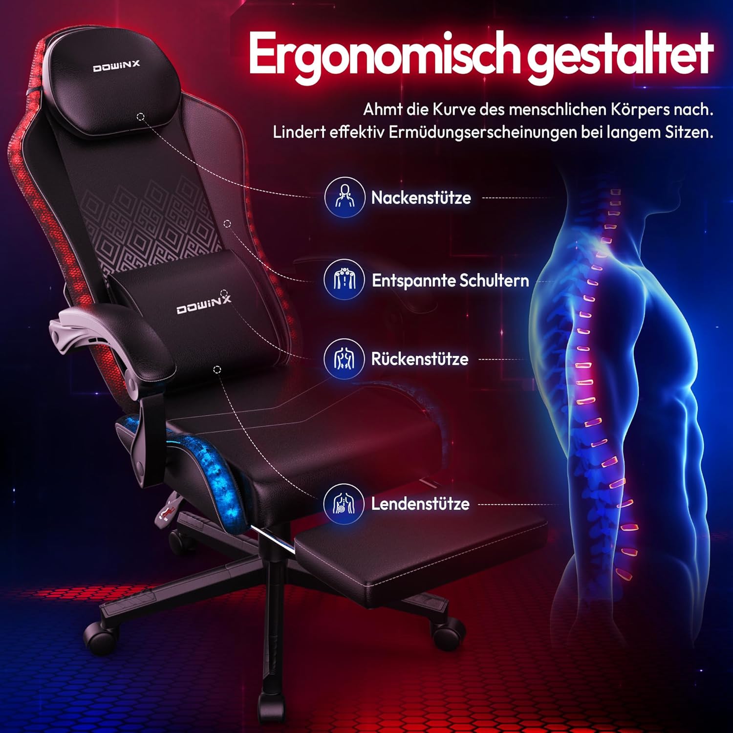 - 💺 Ergonomisches Design: Unterstützt Rücken & Haltung bei langen Gaming-Sessions
