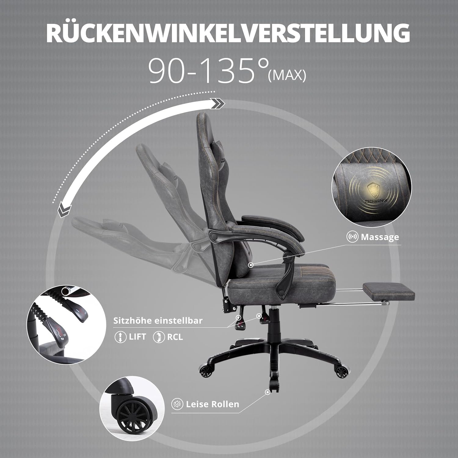 Einfache und reichhaltige Funktionen: leichtgängige Räder mit 360°-Drehung, leicht zu bewegen; Die Rückenlehne kann von 90° bis 135° geneigt werden und eignet sich zum Arbeiten, Spielen, Lesen oder für ein Nickerchen. Die Kopfstütze und das Lendenpolster können je nach Bedarf in eine bequeme Position gebracht werden.