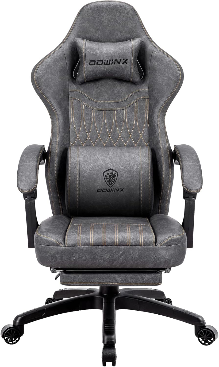 Dowinx Gaming Chair with Spring Cushion and Massage Function, High Racing Office Chair with Adjustable Lumbar Support, Ergonomic PC Chair with Footrest in PU Leather (Grey)