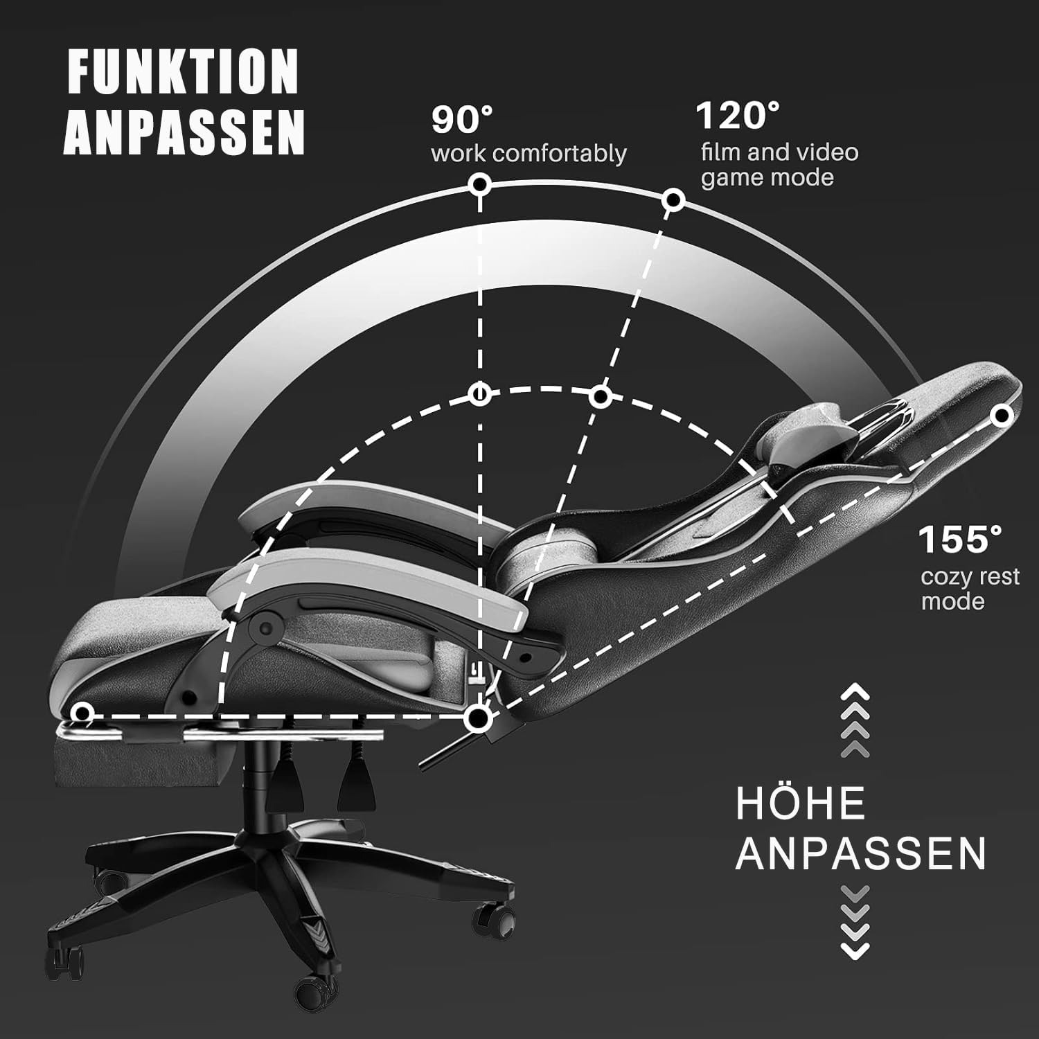 Mehrere Einstellungen: Ausziehbare Fußstütze zur Fußentspannung; 10 cm Höhenverstellung passt sich Kindern, Jugendlichen und Erwachsenen an. 90°-150° Rückenlehne wechselt zwischen Sitz- und Liegeposition, 360° drehbarer Sitz + leise Universalmittel ermöglichen flexible Bewegung ohne Hindernisse.