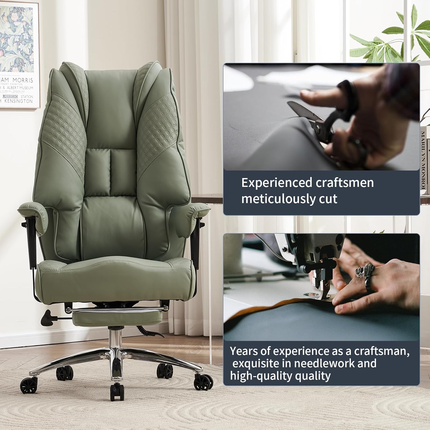 Ergonomic Office Chair, Executive Chair with High Backrest, Adjustable Armrests and Wide Seat, PU Leather Swivel Chair, Height-Adjustable Desk Chair, Maximum Load 200 kg (Light Green)