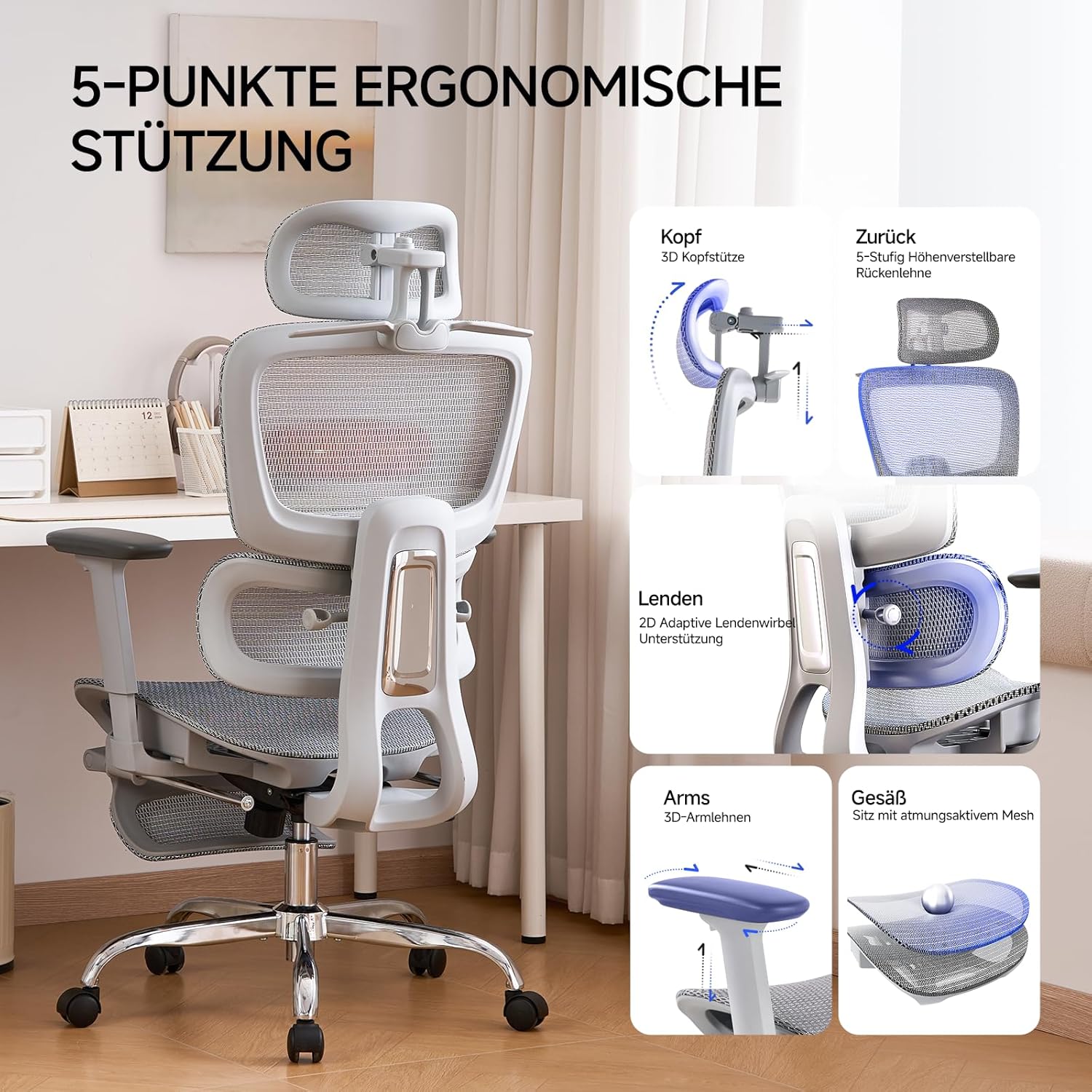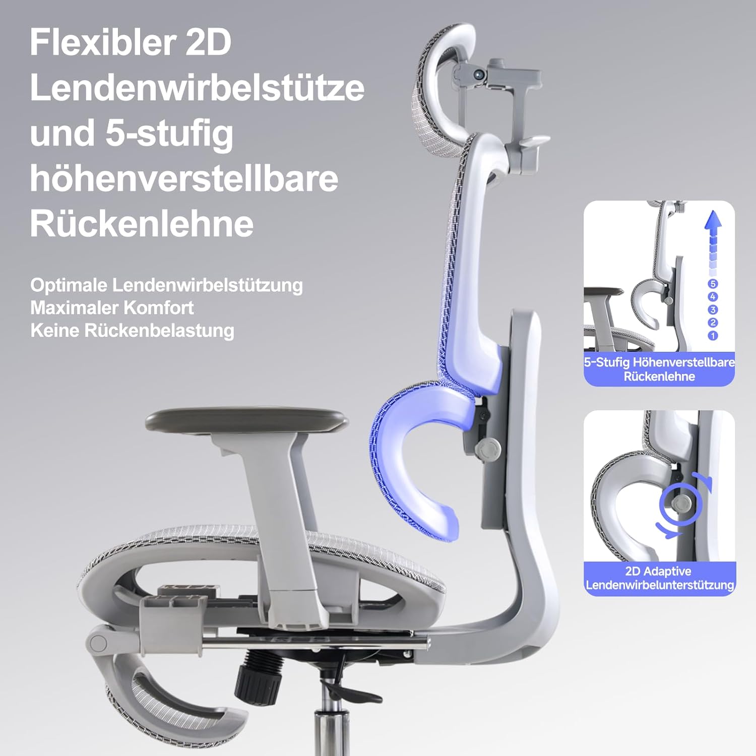2D-Lendenwirbelstütze und 3D-Armlehnen: Adaptive Lordosenstütze und verstellbare Armlehnen sorgen für eine präzise Anpassung; lindert Rückenschmerzen und fördert eine gesunde Sitzhaltung im Büro oder Arbeitszimmer