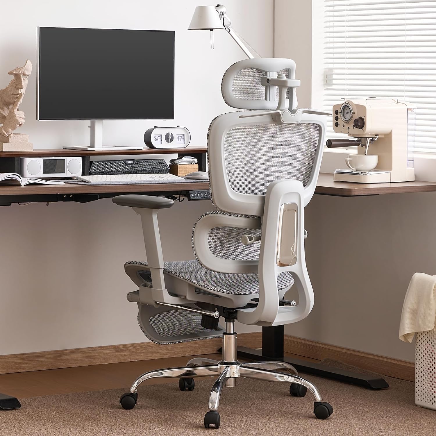 Ergonomic Office Chair with Footstool and 3D Armrests, Gaming Chair with 5-Way Height Adjustment, 2D Lumbar Support, 145° Tilt Function for Office/Study Room, Mesh Desk Chair, Grey