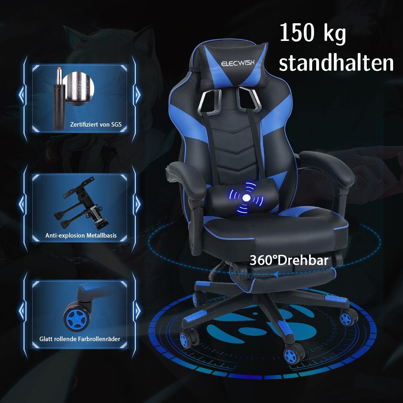 Hervorragende Qualität: hohe Rückenlehne mit abnehmbarer, gepolsterter Kopfstütze und Lendenkissen zur Unterstützung von Nacken und Wirbelsäule. Der Gaming-Stuhl ist bis zu 150 kg belastbar. Dieser Massage-Gaming-Stuhl mit Fußstütze ist ein toller Begleiter für Arbeit, Lernen und Computerspiele