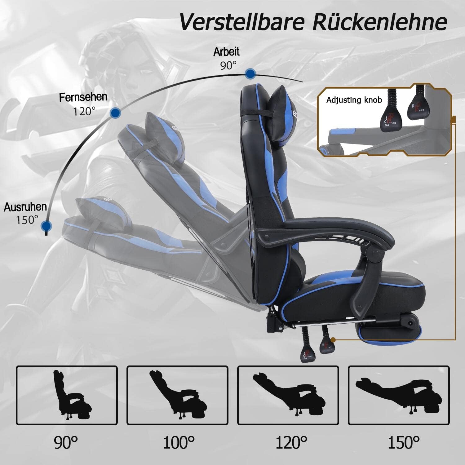 -90°-150° neigbarer Bürostuhl: Die Rückenlehne des Gaming-Stuhls lässt sich von 90° bis 180° verstellen (empfohlen 150°)