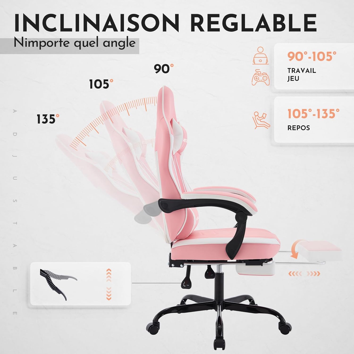 Vielseitige Einstellung: Dieser Gaming-Stuhl hat einen Neigungswinkel von 90 bis 135° und ist mit einer versteckten Fußstütze ausgestattet. Der Bürostuhl lässt sich nicht nur stufenlos in der Höhe verstellen und in der Neigung arretieren, sondern auch das Kissen nach Belieben anpassen, um unterschiedlichen Bedürfnissen gerecht zu werden.