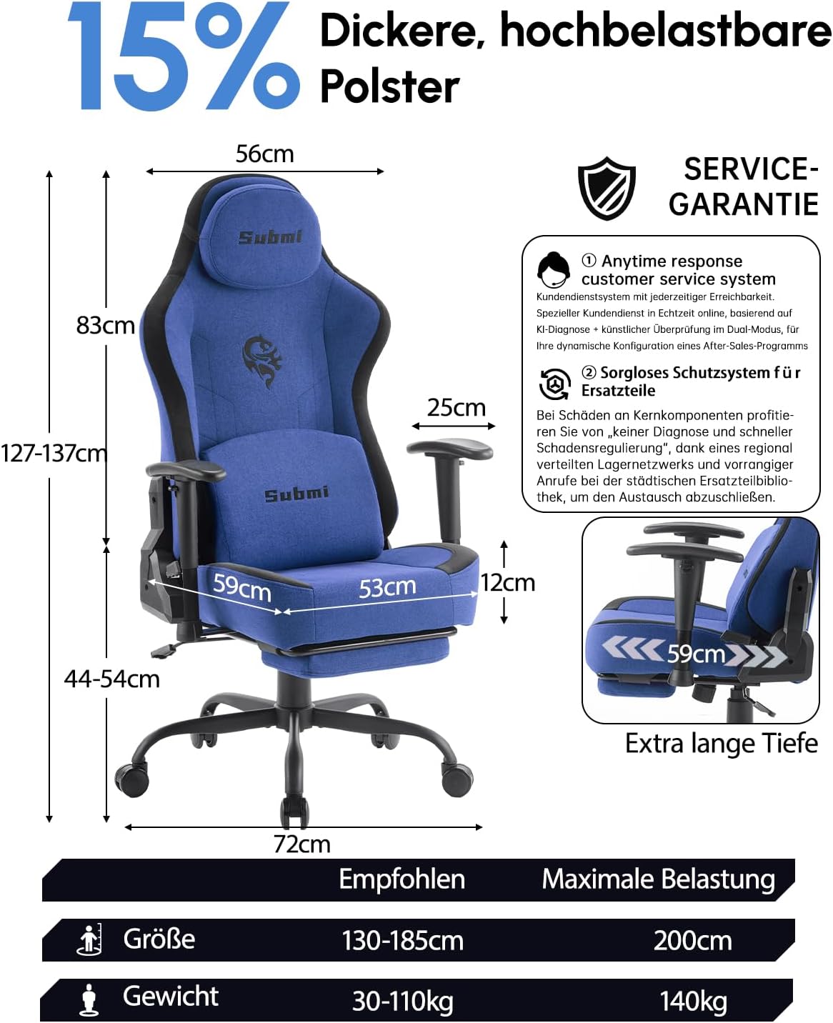 Erstklassiger Stoff und langlebige Qualität – Der Submi-Gaming-Stuhl bietet großzügige Bewegungsfreiheit mit extra breiter Sitzfläche. Das dicke Naturlatexkissen passt sich sanft an und sorgt für hohen Sitzkomfort. Das kratzfeste, langlebige Material ist ideal für den täglichen Gebrauch. Der atmungsaktive, hautfreundliche Stoff sorgt auch bei längerem Sitzen für ein trockenes, angenehmes Tragegefühl. Hochwertige Verarbeitung garantiert langanhaltende Stabilität