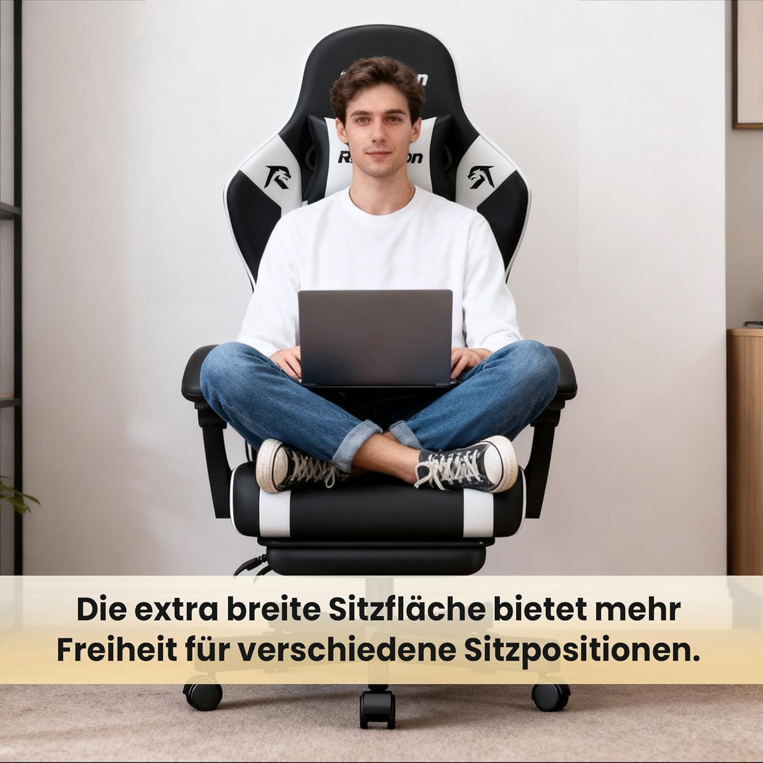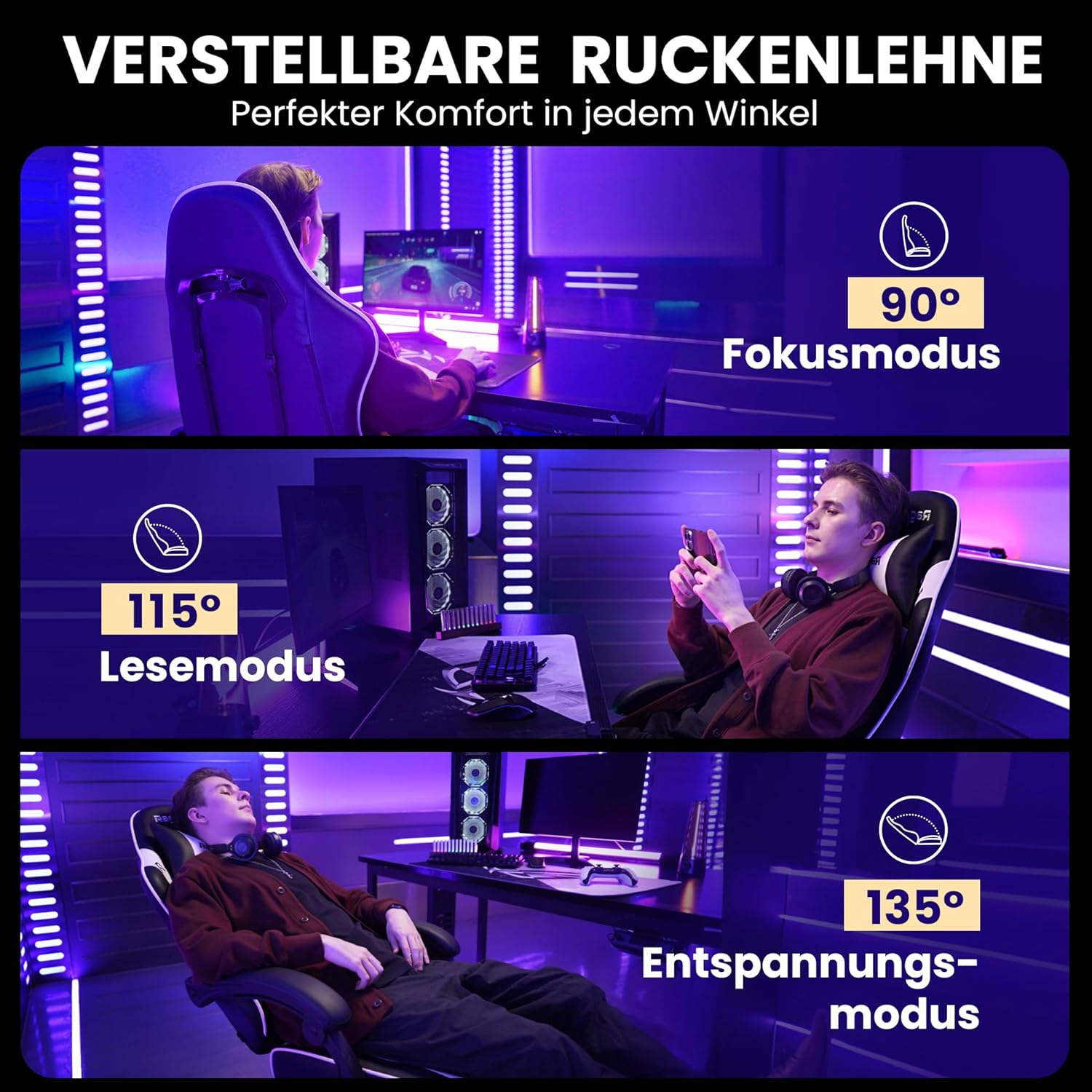 Ergonomischer Gaming-Stuhl für Entspannung und Komfort: Leiden Sie nach stundenlangem Spielen oder Arbeiten am Schreibtisch unter Nacken- und Rückenschmerzen? Der Riftracer Gaming-Stuhl verfügt über zwei verstellbare Rückenlehnen, die Nacken und Rücken optimal stützen. Der Neigungswinkel der Rückenlehne lässt sich flexibel an Ihre Körperform anpassen. Dank des ergonomischen Designs entlastet die Rückenlehne Ihren Körper und sorgt für unvergleichlichen Komfort und Entspannung.