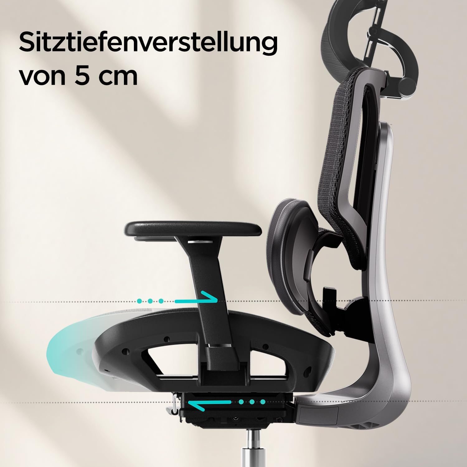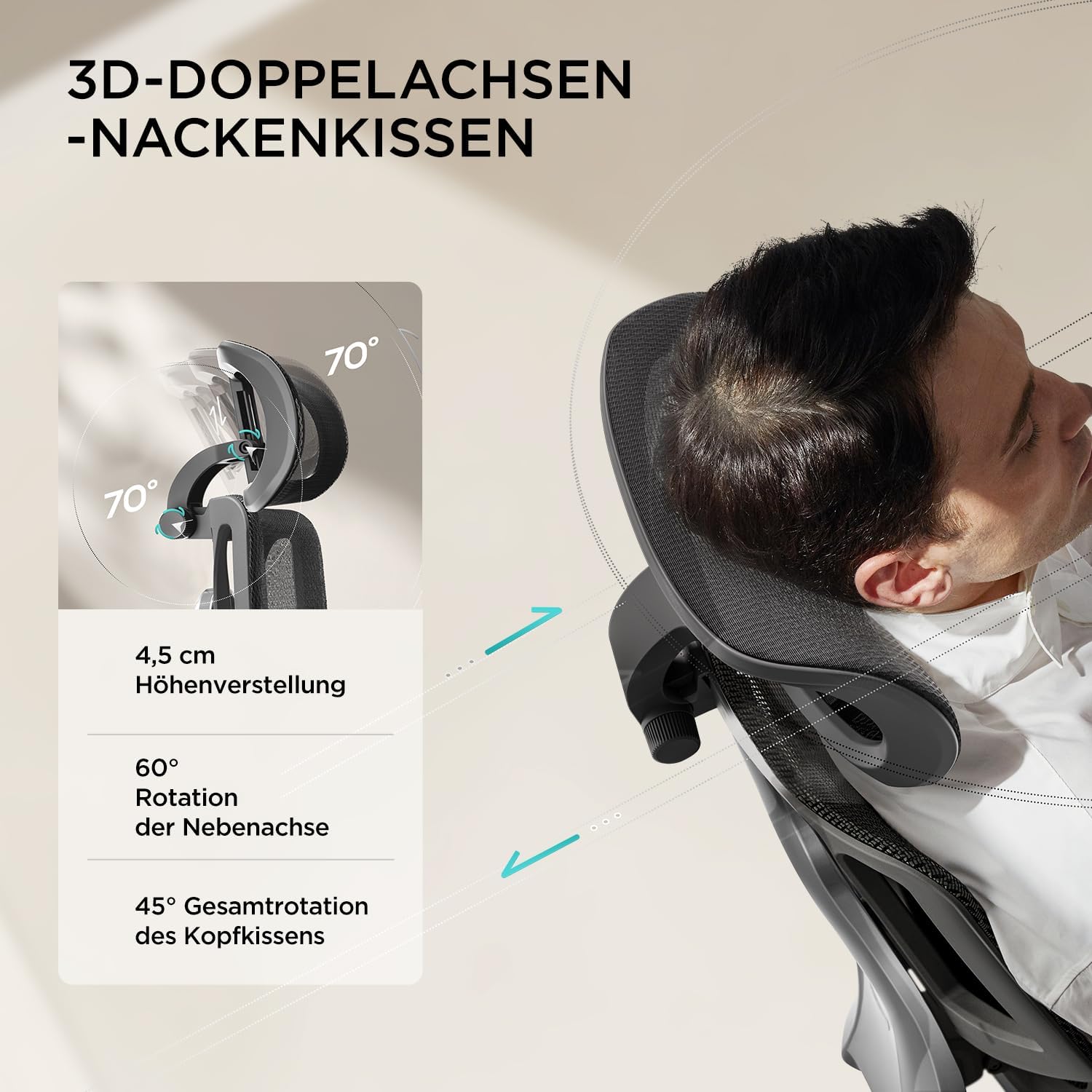 3D-VERSTELLBARE KOPFSTÜTZE: Die Kopfstütze des Hbada E3 Air Bürostuhls ist dreidimensional verstellbar, um Nacken und Kopf in jeder gewünschten Position optimal zu stützen.