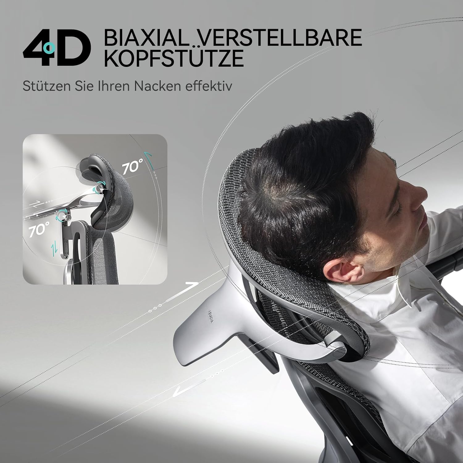 4D Biaxial verstellbare Kopfstütze. Die Kopfstütze des Hbada E3 Pro Schreibtischstuhls ist in 4 Dimensionen verstellbar, um Nacken und Kopf in jeder gewünschten Position vollständig zu stützen.