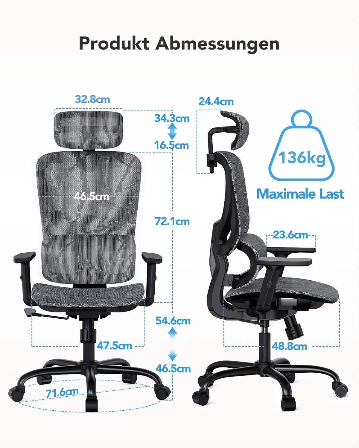 Bewährte Haltbarkeit: Unser atmungsaktiver Computerstuhl mit hoher Rückenlehne hat die BIFMA-Tests bestanden, um dauerhafte Leistung und Zuverlässigkeit zu gewährleisten. Der SGS-zertifizierte Gaslift der Klasse 3 und die stabile 70-cm-Stahlbasis können bis zu 300 Pfund tragen und sorgen für erhöhte Haltbarkeit und Sicherheit. Unsere eingeschränkte 3-Jahres-Garantie sorgt für zusätzliche Sicherheit beim Kauf