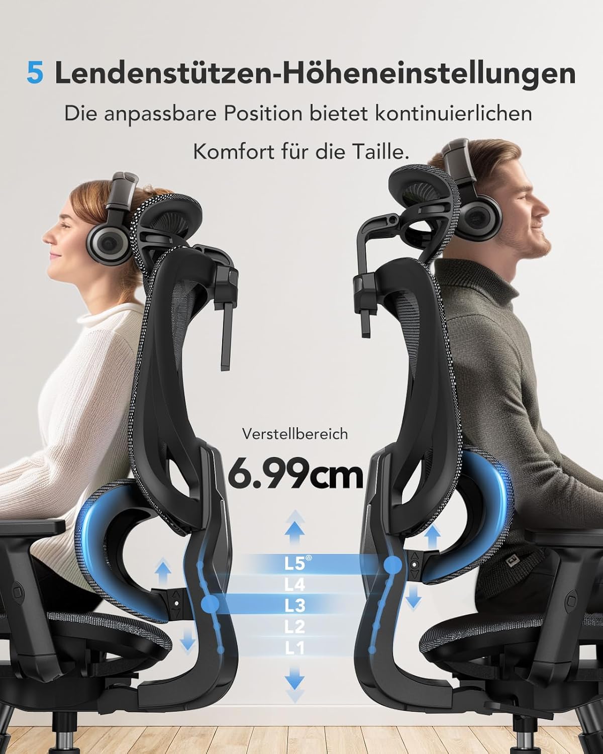 5 Höhenstufen der Lordosenstütze: Mit einem Verstellbereich von 7 cm bietet dieser Schreibtischstuhl gezielte Unterstützung für Benutzer unterschiedlicher Körpergröße. Positionieren Sie die Lendenwirbelstütze genau dort, wo Sie sie benötigen, um Ihren unteren Rücken sanft zu stützen – ideal zur Linderung von Rückenschmerzen bei langen Arbeits- oder Spielstunden. Wenn die höchste Position eingestellt ist, kehrt sie automatisch zur niedrigsten Ebene zurück