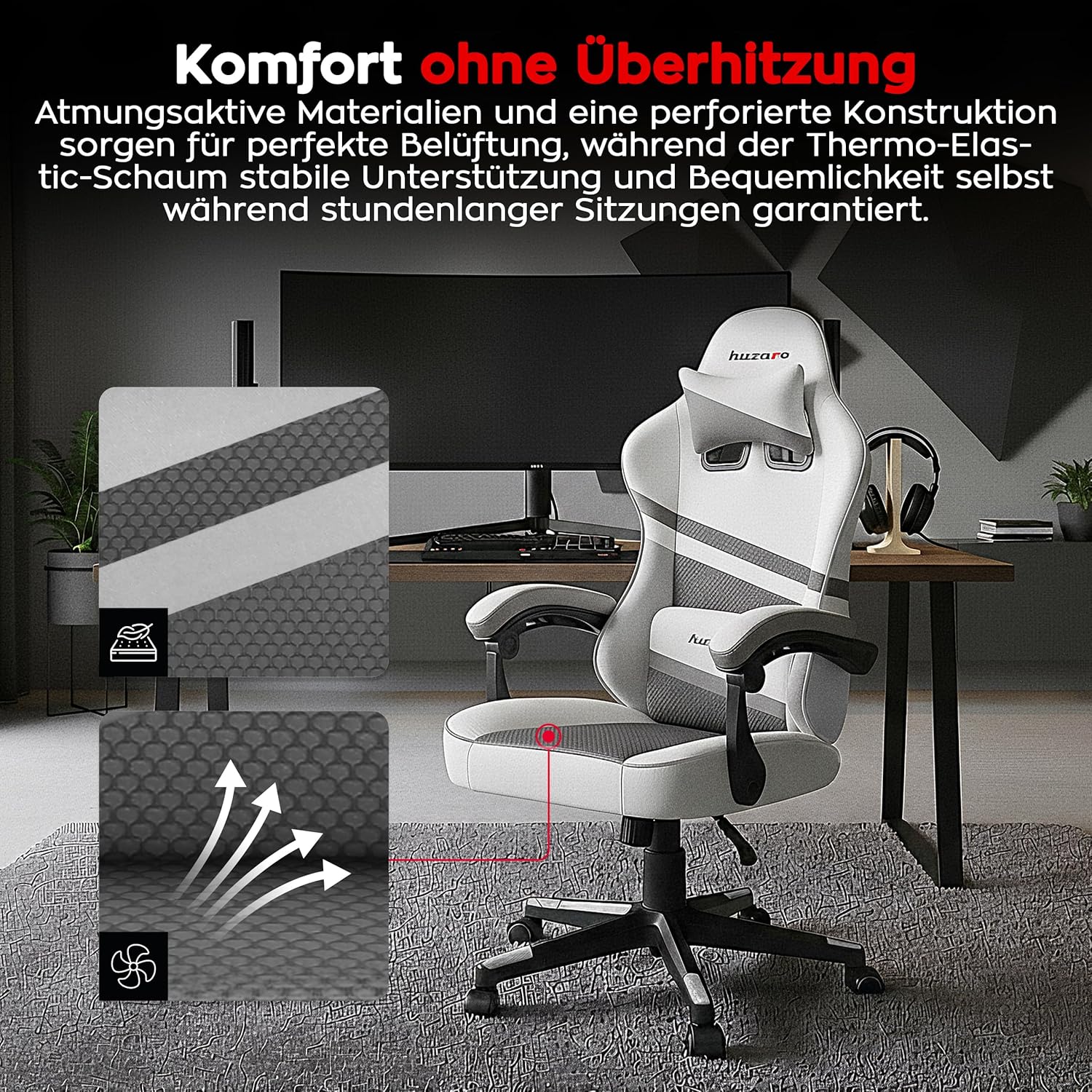 Das spezielle Design in Kombination mit dem atmungsaktiven Material macht die Gaming-Sitze ideal für das Gaming an heißen Tagen – sie leiten die Wärme ab und bieten maximalen thermischen Komfort.