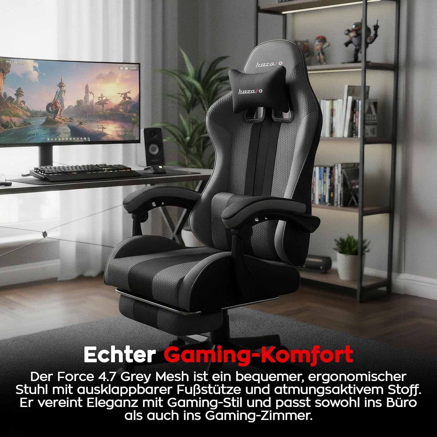 Ergonomischer Gaming-Stuhl mit Fußstütze: Der Huzaro Force 4.7 Grey Mesh vereint Komfort und Stil – ideal als ergonomischer Gaming-Stuhl für lange Sessions mit ausklappbarem Fußteil und atmungsaktiven Materialien.