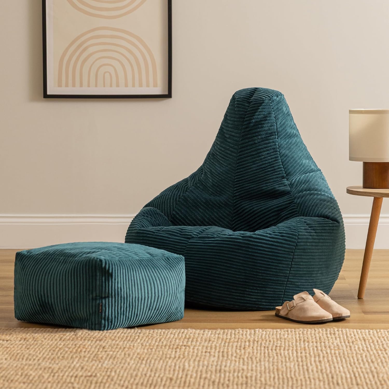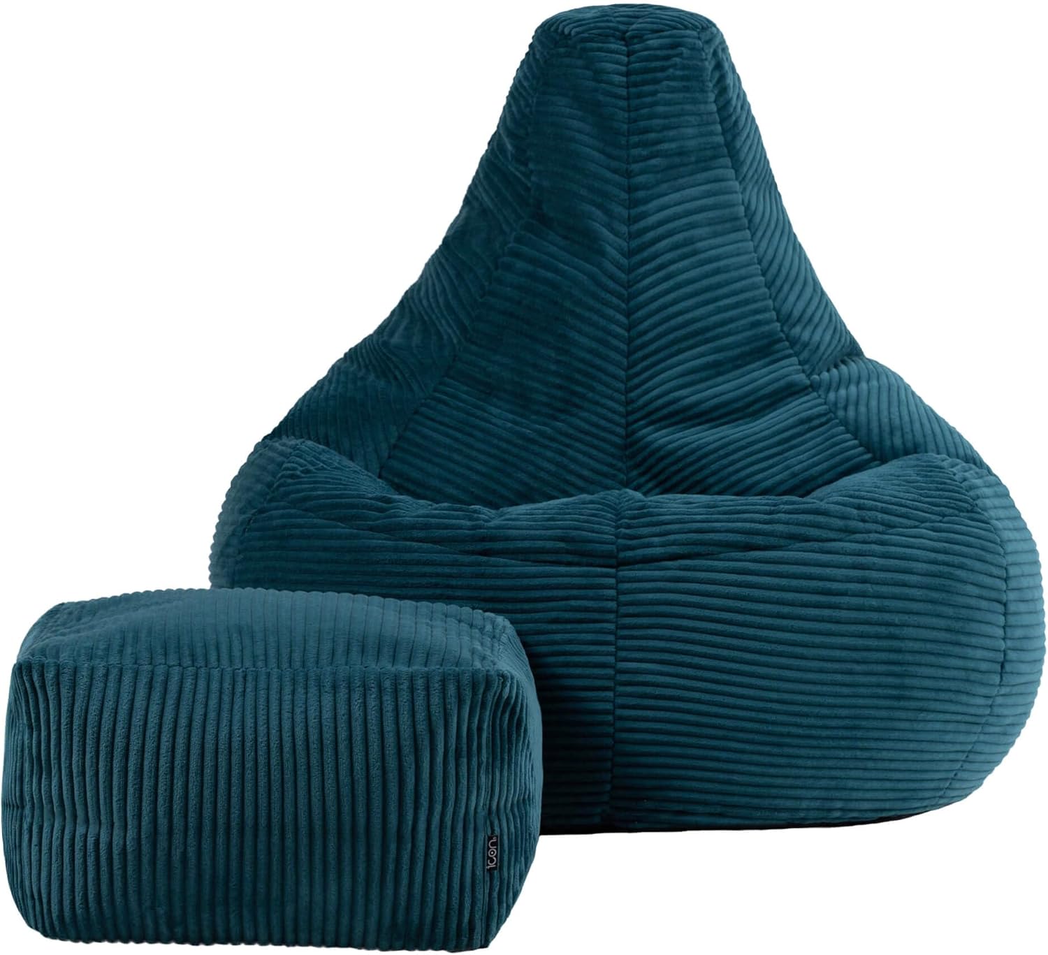 Icon Dalton Corduroy Bean Bag with Stool, Teal, Adult Gaming Bean Bag with Filling, Bean Bag, Corduroy Chair, Lounge Chair, Bedroom, Living Room Furniture