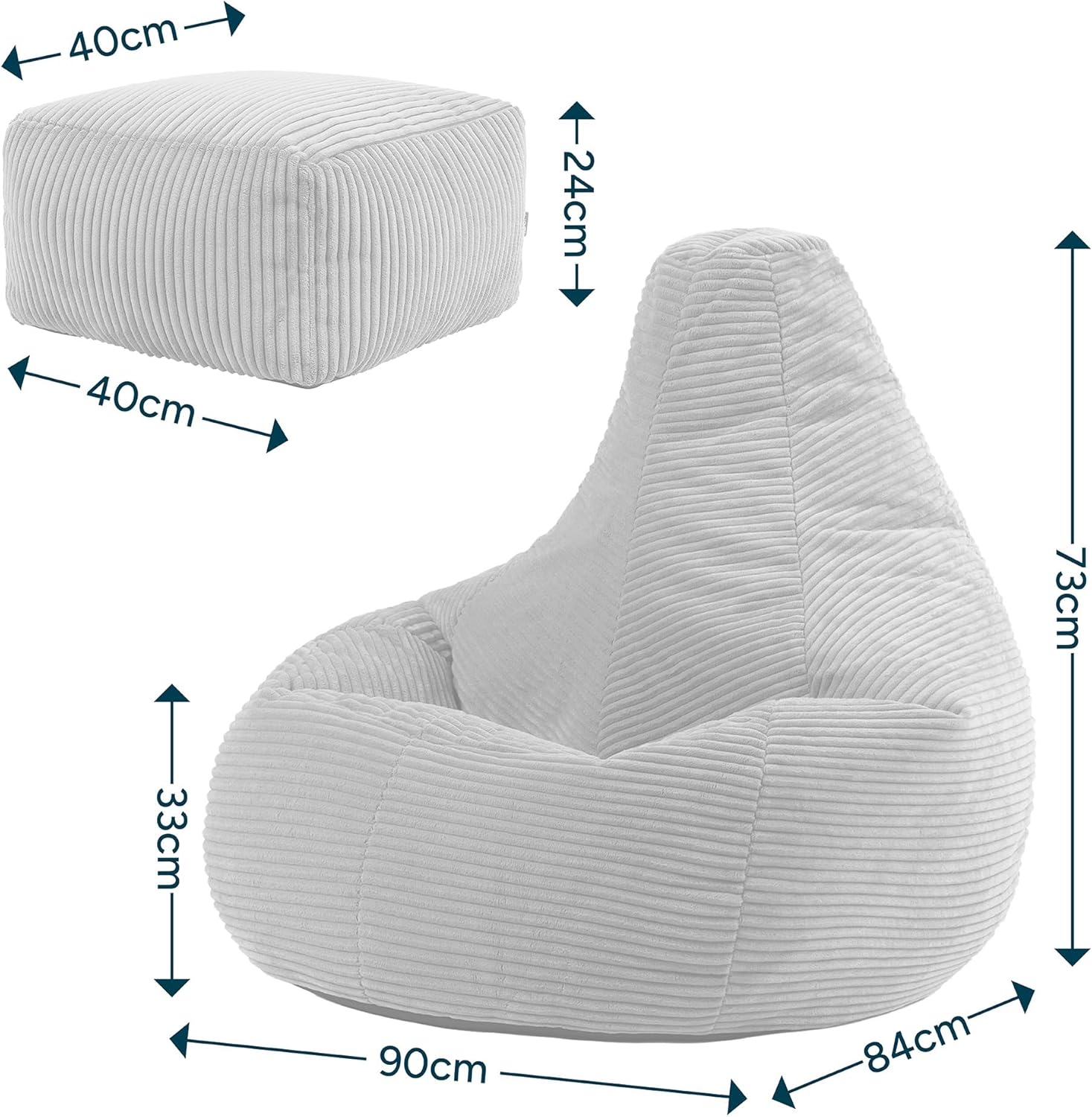 Get ready for the ultimate comfort upgrade! Enhance your relaxation experience with our chair and footstool set, complete with a matching bean bag pouf. Made of soft corduroy fabric, you will never want to get up.