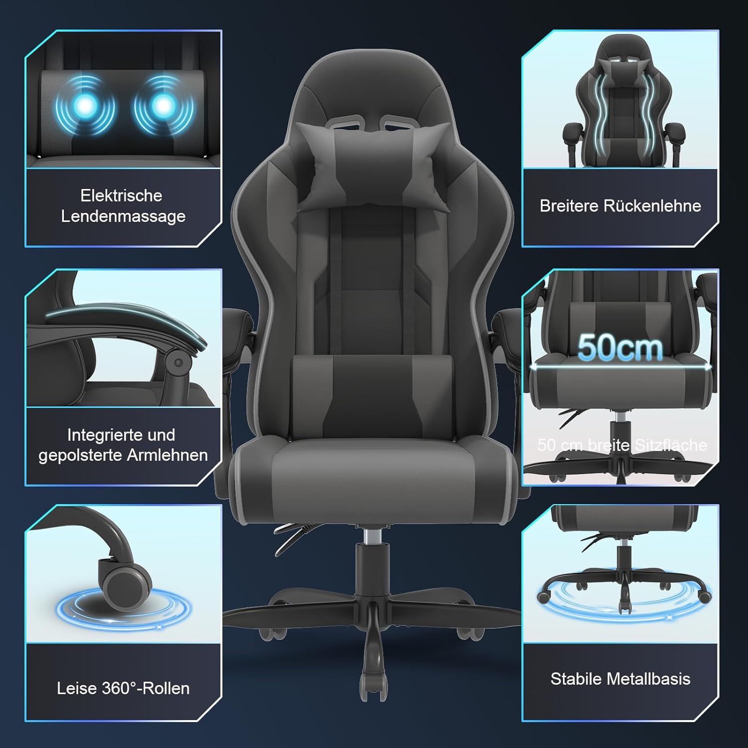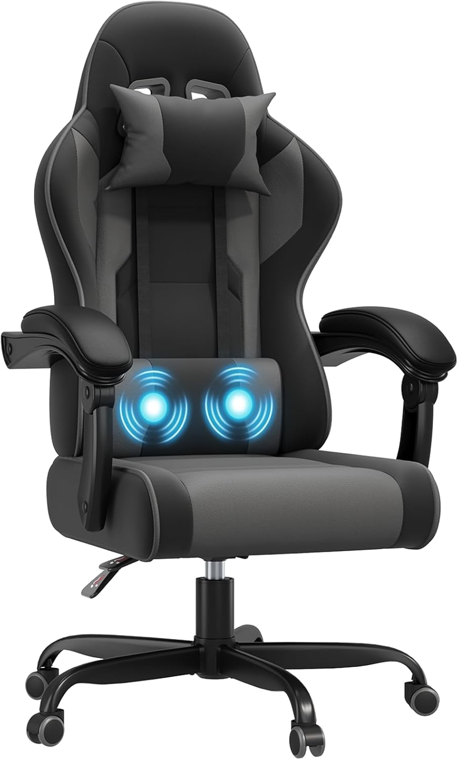 JUMMICO Gaming Chair with Massage Function, Office Chair Ergonomic 150 kg, Gamer Chair with 50 cm Extra Wide Seat Cushion, Grey