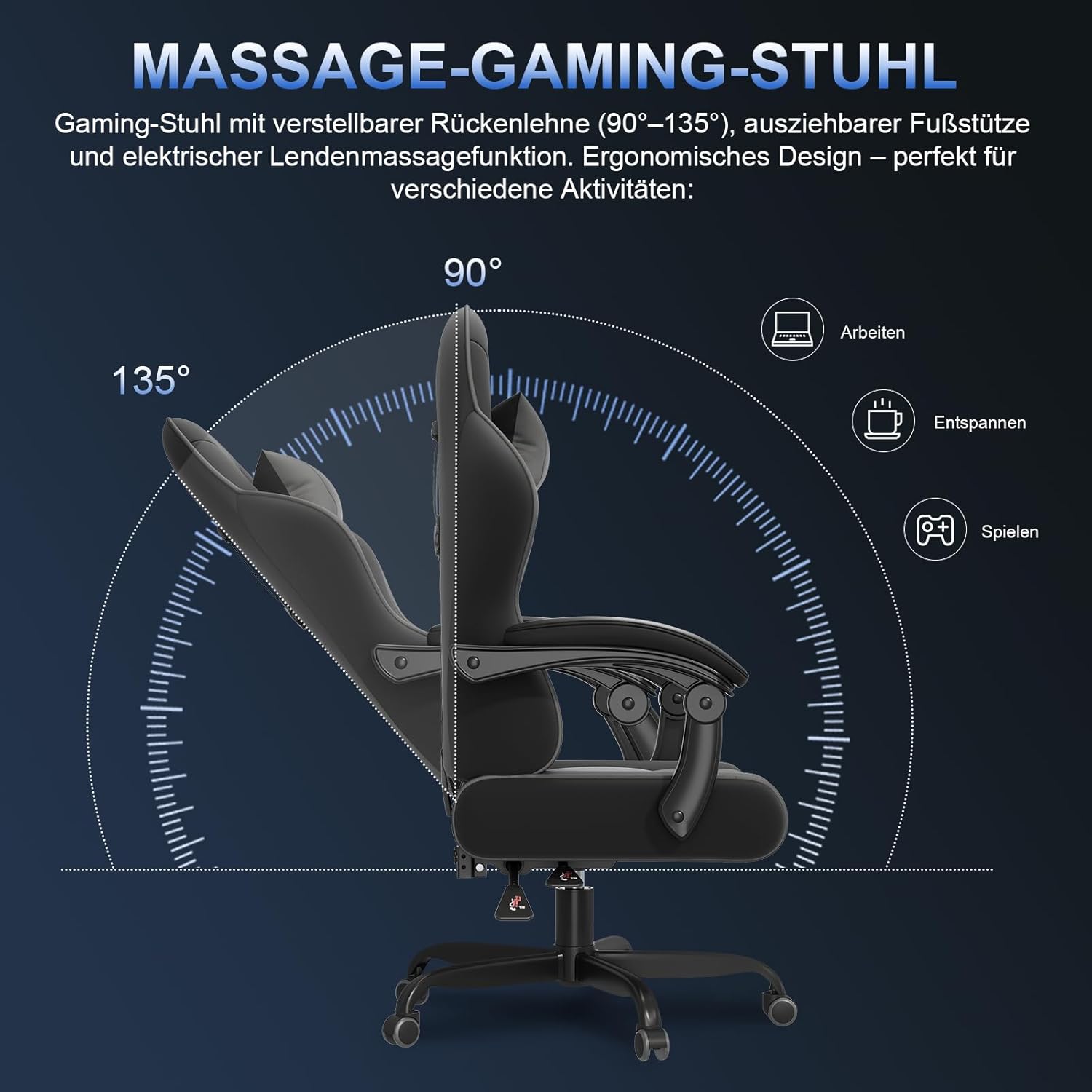 Vielfältige Entspannungsfunktionen: 3-fach verstellbare Rückenlehne (90°/120°/150°) mit verstellbaren Armlehnen; integrierte USB-Massagefunktion zur Entspannung.
