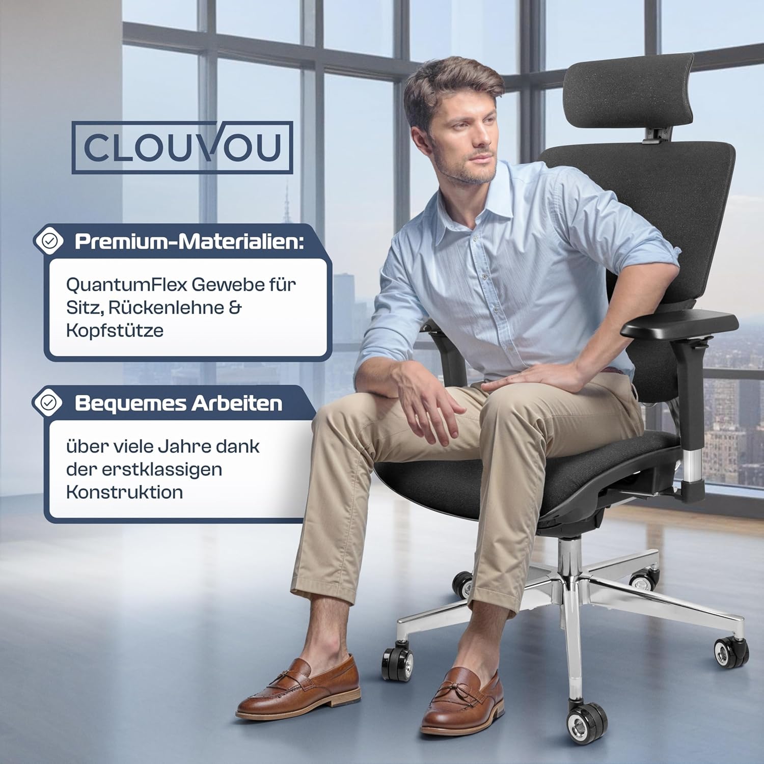 Atmungsaktiv – Dank des atmungsaktiven ergonomischen Stuhlnetzbezugs aus elastischen Nylonfasern erfährt Ihr Körper zu jeder Jahreszeit Komfort und Sie werden sehen, warum der Bürostuhl Clouvou zum Ergonomie-Testsieger geworden ist.