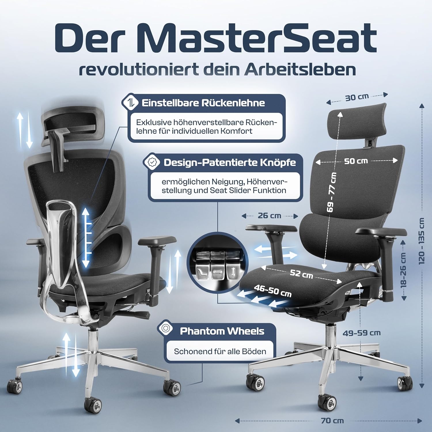 Ihr Upgrade – Der bis zu 150 kg belastbare MasterSeat-Bürostuhl verfügt außerdem über eine höhenverstellbare Gaming-Stuhl-Rückenlehne und ist sowohl per Knopftechnik als auch mit unseren besten Phantom Wheels bedienbar.