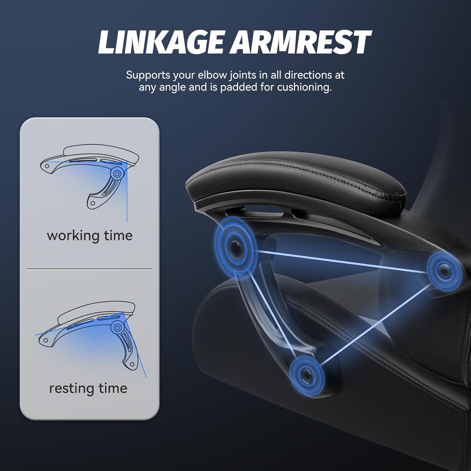 Verbindungsarmlehne: Dieser Gaming-Stuhl verfügt über eine mit hochdichtem Schaumstoff gepolsterte Verbindungsarmlehne. Eine solche Gestängearmlehne kann mit der verstellbaren Rückenlehne bewegt werden, um Ihren Ellenbogen oder Arm besser zu stützen.