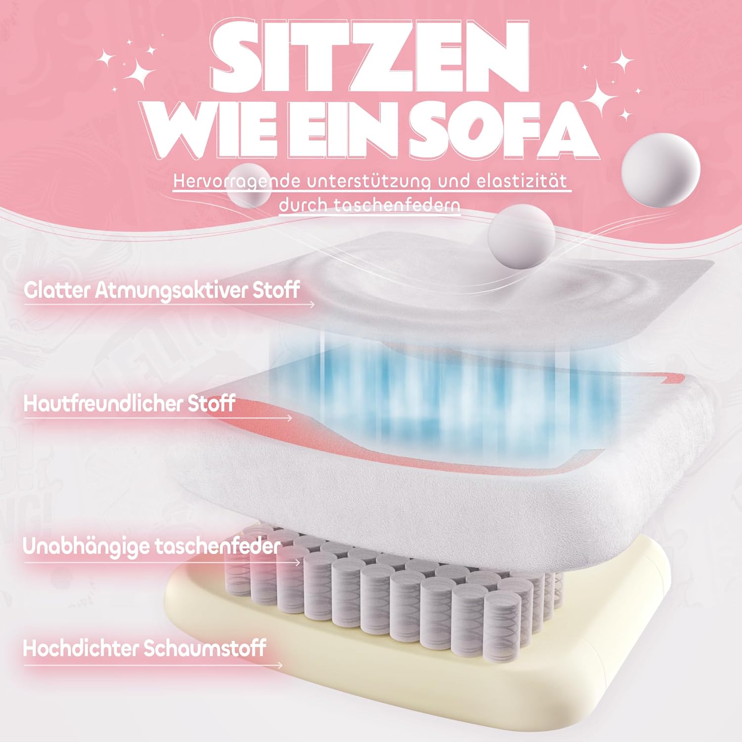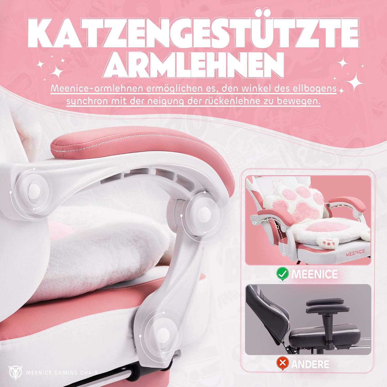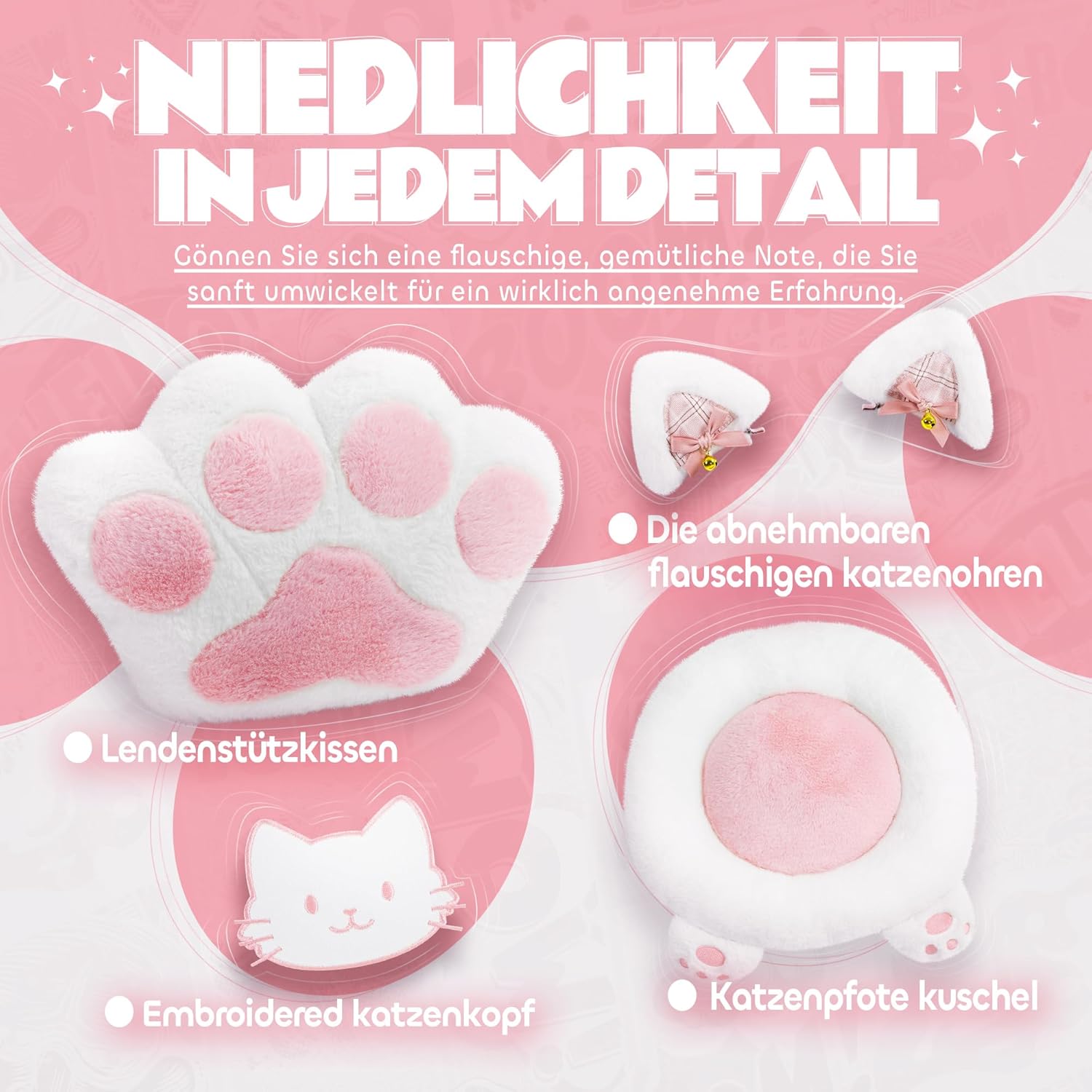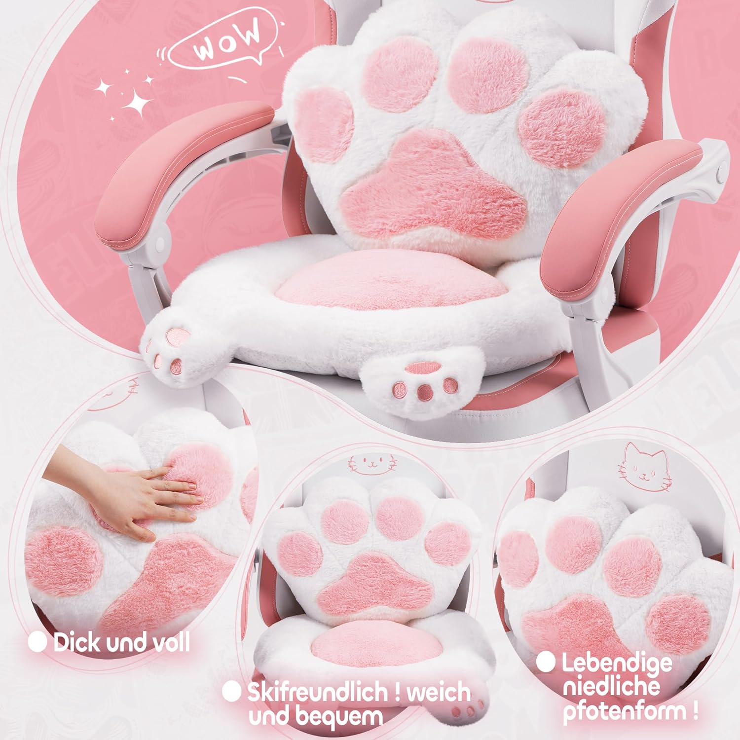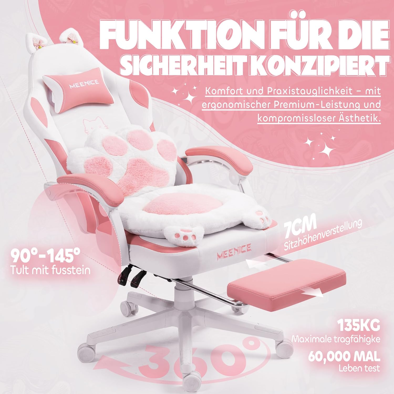 ERGONOMISCHER KOMFORT UND VERSPIELTES DESIGN Dieser Gaming-Stuhl verfügt nicht nur über ein ergonomisches Katzenpfoten-Sitzkissen und Lendenkissen, sondern auch über ein gefedertes Sitzkissen, sodass Sie ein stilvolles und ultimatives Sitzerlebnis genießen können. Es gibt auch abnehmbare Katzenohren, die für einen Hauch von Skurrilität sorgen. Perfekt für alle, die bei langen Gaming- oder Arbeitssitzungen sowohl Wert auf Ästhetik als auch Funktionalität legen.