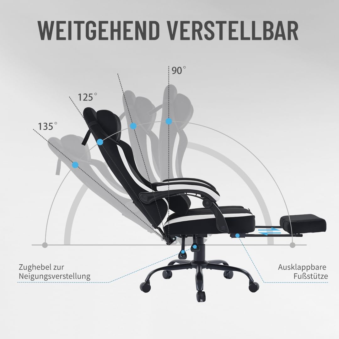 Einstellbar und einfach zu installieren: Passen Sie die Höhe um 10 cm an und neigen Sie die Rückenlehne um bis zu 135 Grad für optimale Flexibilität beim Spielen, Arbeiten oder Entspannen. Der Computerstuhl ist ideal für Benutzer mit einer Körpergröße von 150 cm bis 190 cm. Darüber hinaus ist die Montage des Stuhls schnell und einfach, sodass Sie ohne großen Aufwand und im Handumdrehen Ihren neuen Komfort genießen können.
