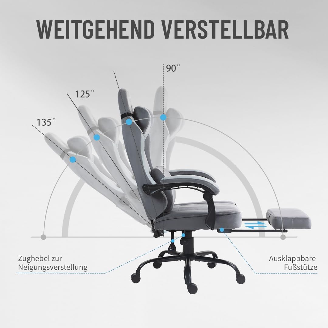 Einstellbar und einfach zu installieren: Passen Sie die Höhe um 10 cm an und neigen Sie die Rückenlehne um bis zu 135 Grad für optimale Flexibilität beim Spielen, Arbeiten oder Entspannen. Der Computerstuhl ist ideal für Benutzer mit einer Körpergröße von 150 cm bis 190 cm. Darüber hinaus ist die Montage des Stuhls schnell und einfach, sodass Sie ohne großen Aufwand und im Handumdrehen Ihren neuen Komfort genießen können.