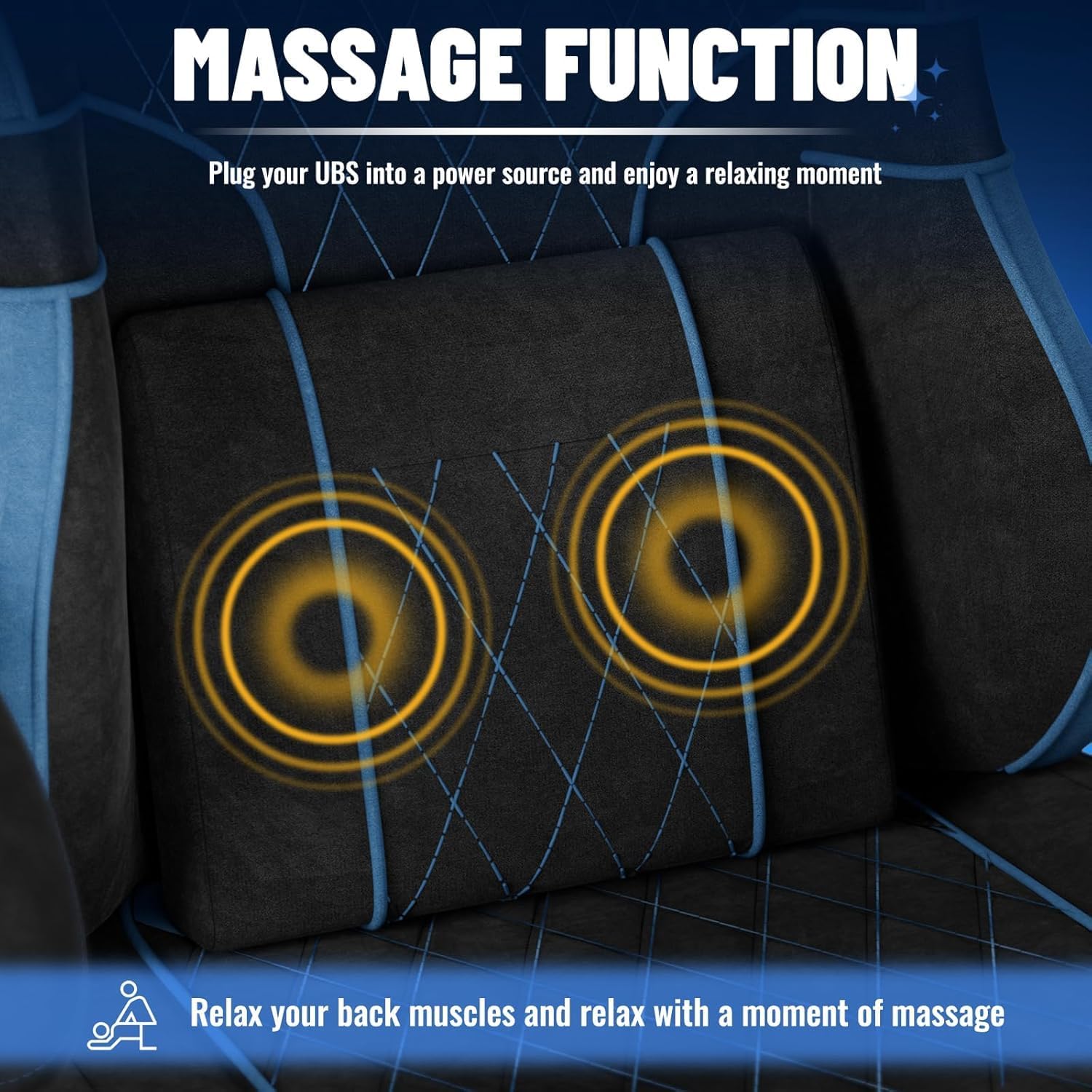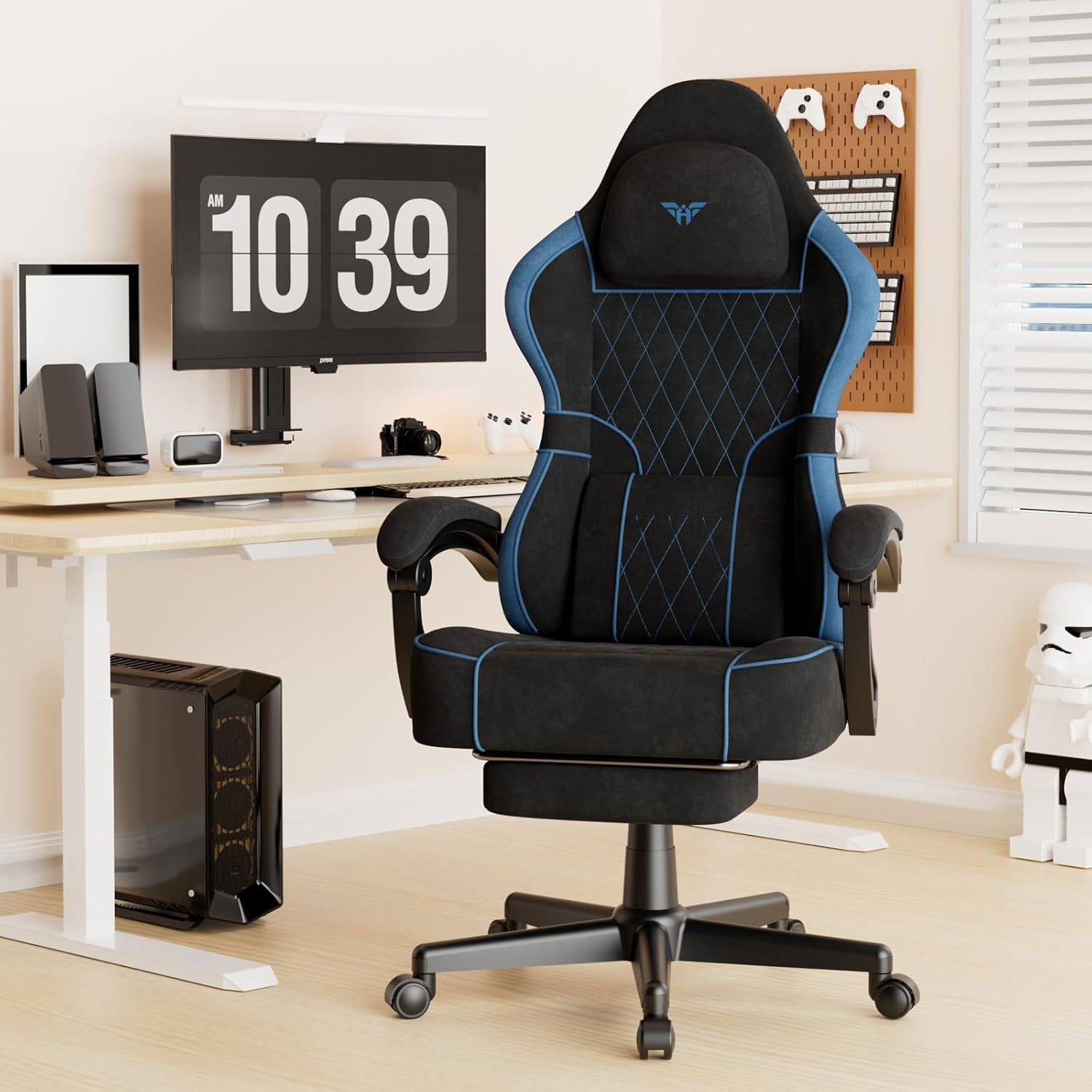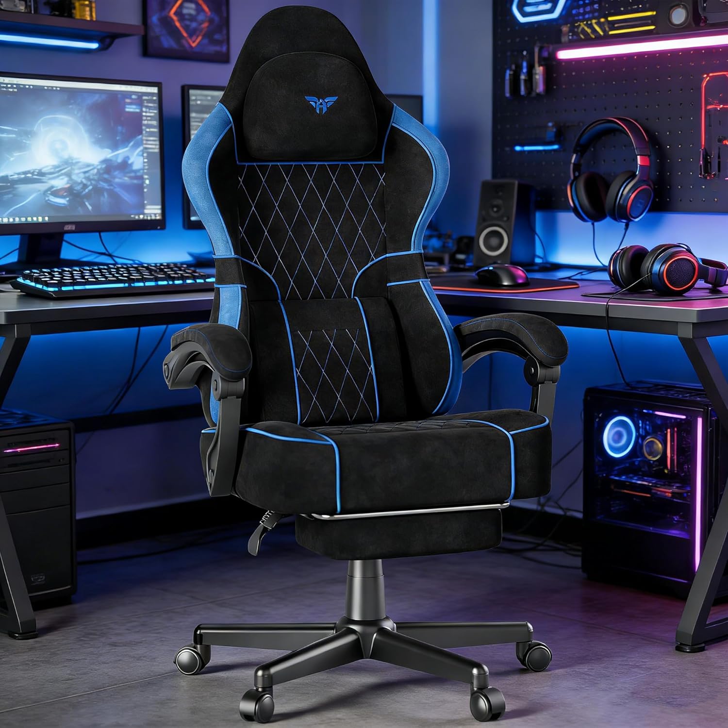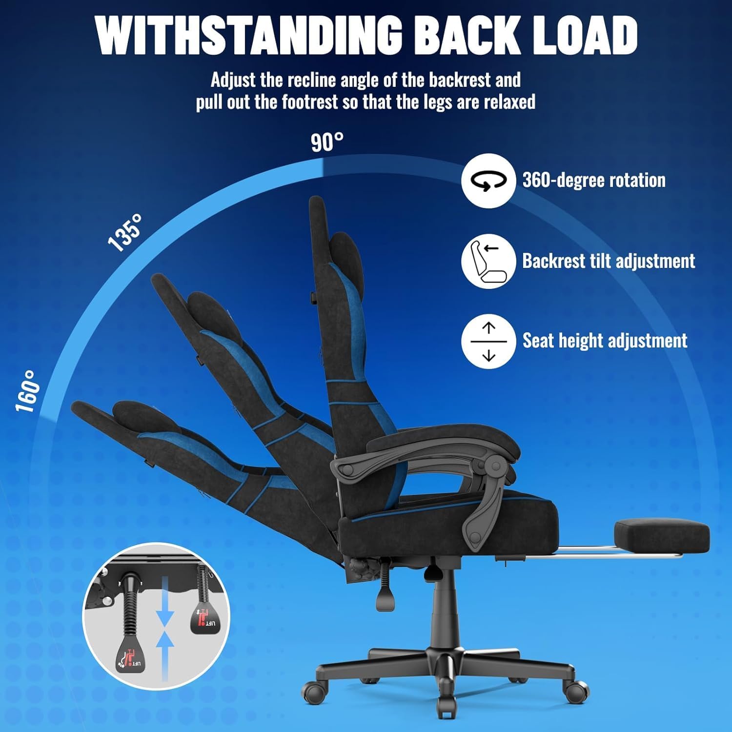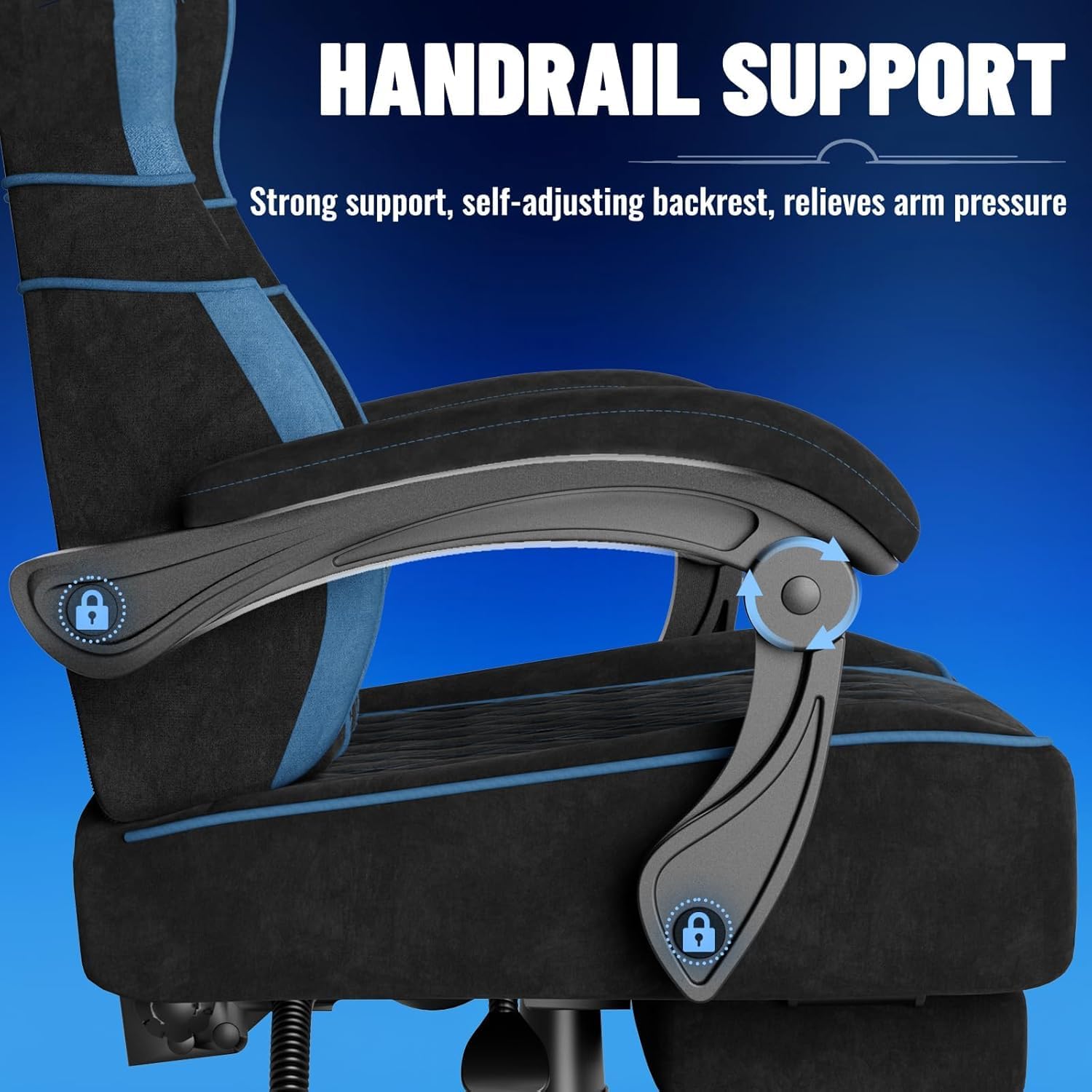 Soontrans Gaming Chair with Massage Lumbar Support, Padded Gaming Chair, Ergonomic Gaming Chair with Footrest, Velvet, 90-160° Backrest Adjustable Gaming Chair (Black and Blue)
