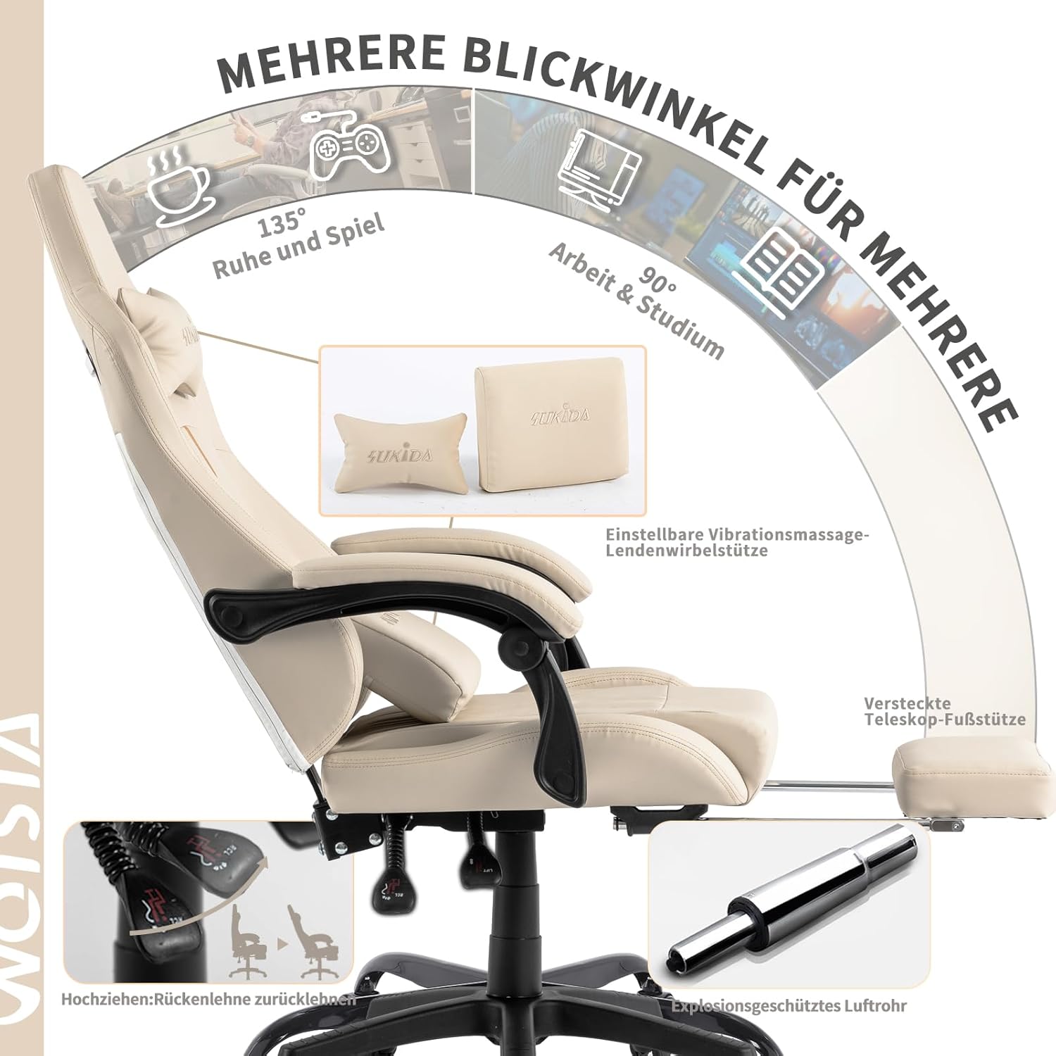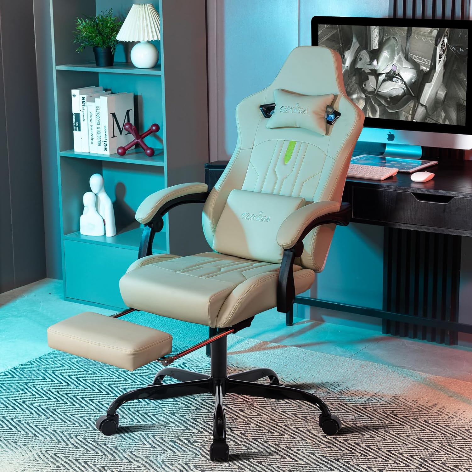 SUKIDA Gaming Chair Computer Chair Ergonomic Gaming Chair with Footrest Office Chair Ergonomic Computer Chair with Lumbar Support Beige