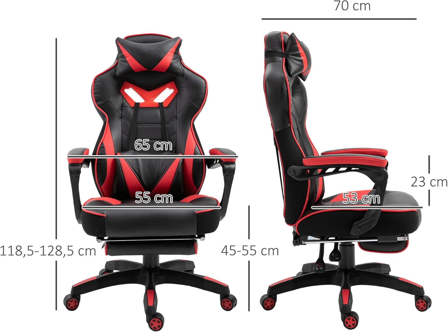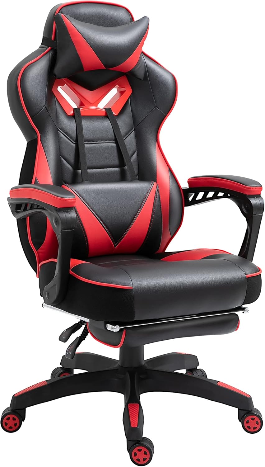 Vinsetto Ergonomic Office Chair, Gaming Chair, Swivel Chair with Retractable Footrest and Adjustable Back Foam + PU Leather + Metal, Black + Red, 65 x 70 x 118.5-128.5 cm